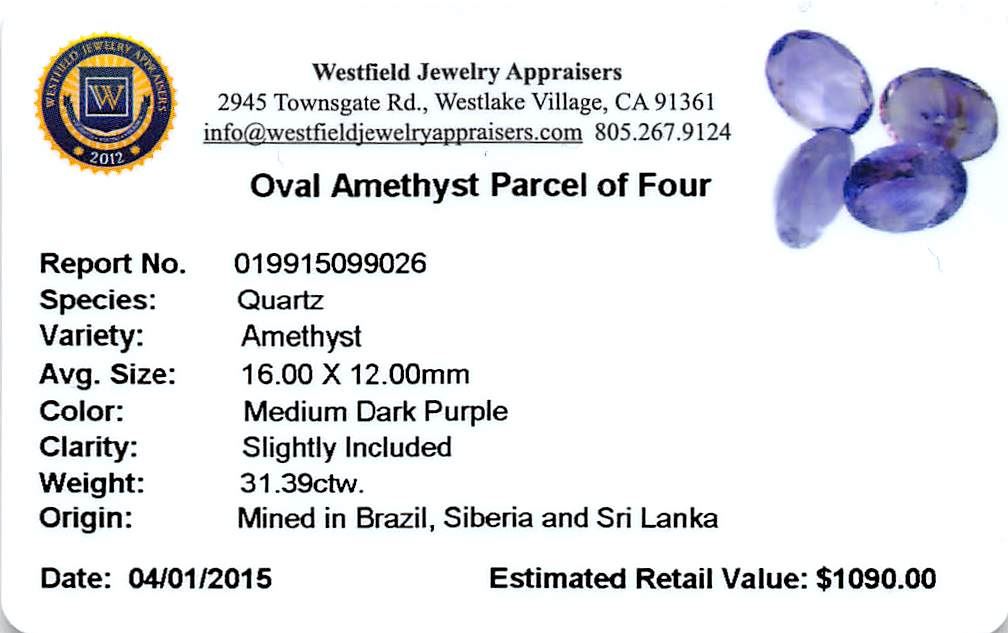 One oval cut natural amethyst exact weight 31.39ct., clarity is slightly included, type II, medium dark, very slightly grayish, purple color, (GIA P 6/3), cut is good. Westfield Appraised at $1,090.00.