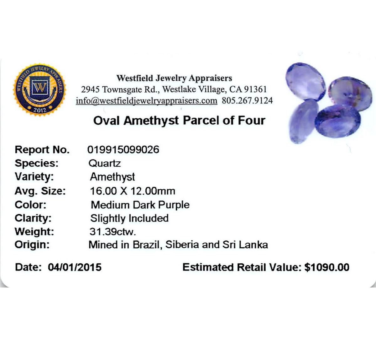 One oval cut natural amethyst exact weight 31.39ct., clarity is slightly included, type II, medium dark, very slightly grayish, purple color, (GIA P 6/3), cut is good. Westfield Appraised at $1,090.00.