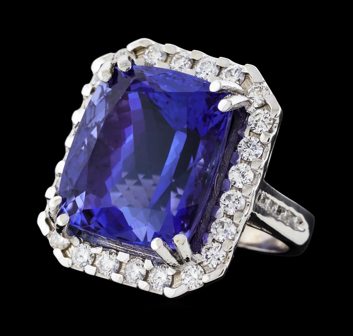 One electronically tested 14KT white gold lady's cast fashion ring with a cathedral shank with a basket halo with a bright polish finish. The featured lady's ring has a shank measuring 3.60 millimeters wide. Identified with markings of '14K'. Condition is new, good workmanship. Containing: One prong set rectangular cushion modified brilliant cut natural tanzanite, measuring 18.04 x 16.20 x 12.75mm, (depth est.) 7%. bulge factor, approximate weight of 31.45ct., clarity is eye clean, medium dark, moderately strong, violetish blue color, (GIA vB 6/4), cut is very good. Transmitting light with no distortion, transparent. Colored gemstones are presumed to have been subjected to commonly used enhancement processes. Graded in the setting. Twenty-Four prong set round brilliant cut diamonds, measuring 2.60 - 2.50 x 1.58mm (depth est.) approximate total weight of 24 Stones = 1.50ct. Graded in the setting. Clarity SI-1 to SI-2. Color: G - I Cut Good Twelve channel set round brilliant cut diamonds, measuring 1.80 - 1.70 x 1.09mm (depth est.) approximate total weight of 12 Stones = 0.25ct. Graded in the setting. Clarity SI-1 to SI-2. Color: H - I Cut Good. Total Weight of Colored Stones 31.45ct.. Total Weight of Diamonds 1.75ct.. Total Weight of Ring 18.50gm. GAS Appraised at $40,125.00.