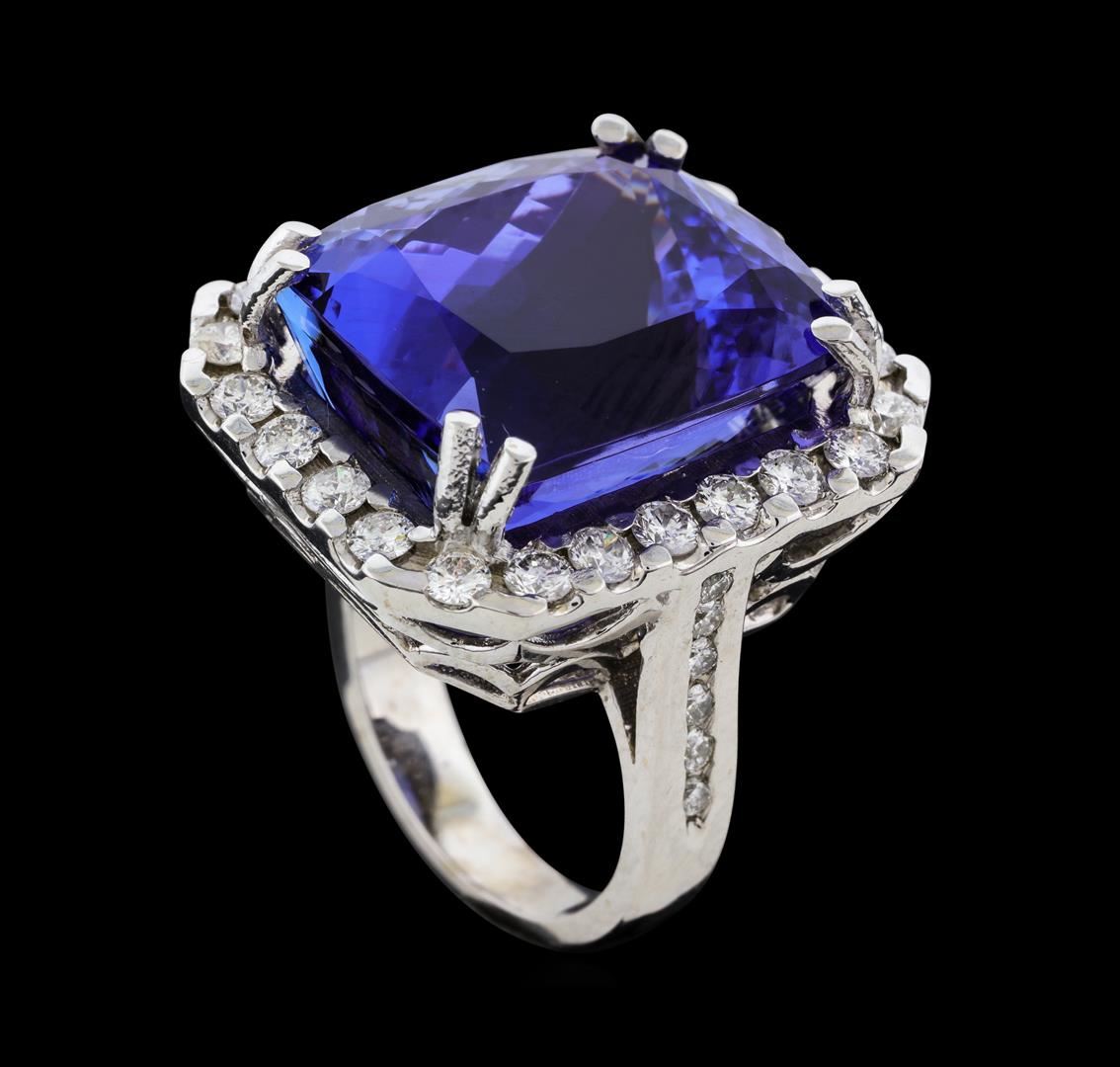 One electronically tested 14KT white gold lady's cast fashion ring with a cathedral shank with a basket halo with a bright polish finish. The featured lady's ring has a shank measuring 3.60 millimeters wide. Identified with markings of '14K'. Condition is new, good workmanship. Containing: One prong set rectangular cushion modified brilliant cut natural tanzanite, measuring 18.04 x 16.20 x 12.75mm, (depth est.) 7%. bulge factor, approximate weight of 31.45ct., clarity is eye clean, medium dark, moderately strong, violetish blue color, (GIA vB 6/4), cut is very good. Transmitting light with no distortion, transparent. Colored gemstones are presumed to have been subjected to commonly used enhancement processes. Graded in the setting. Twenty-Four prong set round brilliant cut diamonds, measuring 2.60 - 2.50 x 1.58mm (depth est.) approximate total weight of 24 Stones = 1.50ct. Graded in the setting. Clarity SI-1 to SI-2. Color: G - I Cut Good Twelve channel set round brilliant cut diamonds, measuring 1.80 - 1.70 x 1.09mm (depth est.) approximate total weight of 12 Stones = 0.25ct. Graded in the setting. Clarity SI-1 to SI-2. Color: H - I Cut Good. Total Weight of Colored Stones 31.45ct.. Total Weight of Diamonds 1.75ct.. Total Weight of Ring 18.50gm. GAS Appraised at $40,125.00.