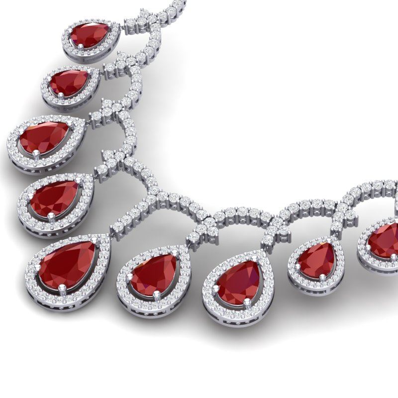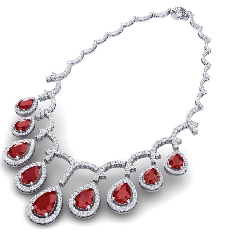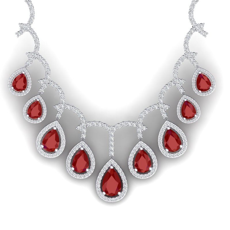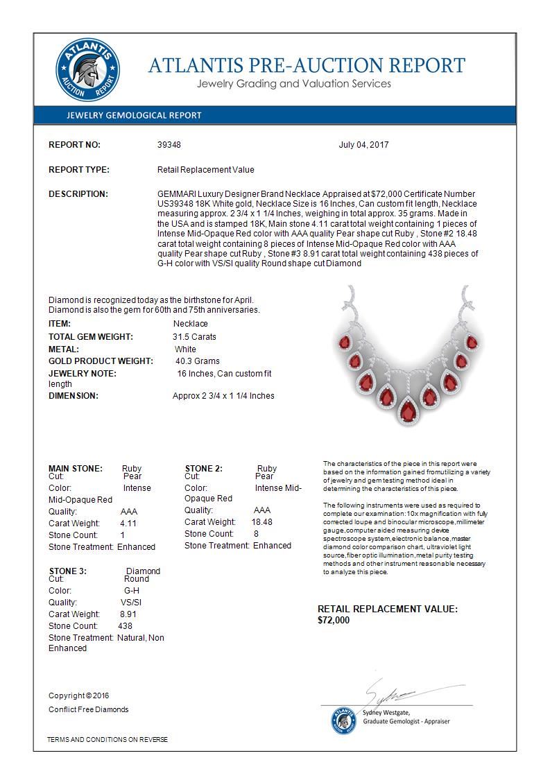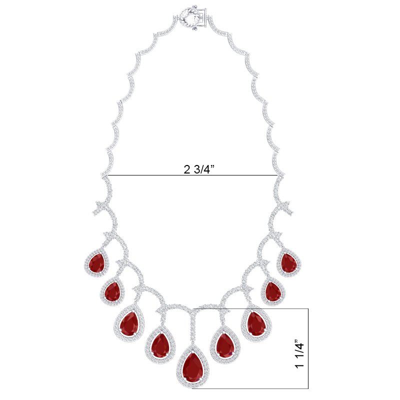 31.5 CTW Royalty Designer Ruby & VS Diamond Necklace 18K White Gold ---- Luxury Designer Brand Necklace Appraised Retail Price at $72,000 ---- SKU Number US39348 18K White gold Necklace Size is 16 Inches, Can custom fit length, Necklace measuring approx. 2 3/4 x 1 1/4 Inches, weighing in total approx. 35 grams. Made in the USA and is stamped 18K, Main stone 4.11 carat total weight containing 1 pieces of Intense Mid-Opaque Red color with AAA quality Pear shape cut Ruby , Stone #2 18.48 carat total weight containing 8 pieces of Intense Mid-Opaque Red color with AAA quality Pear shape cut