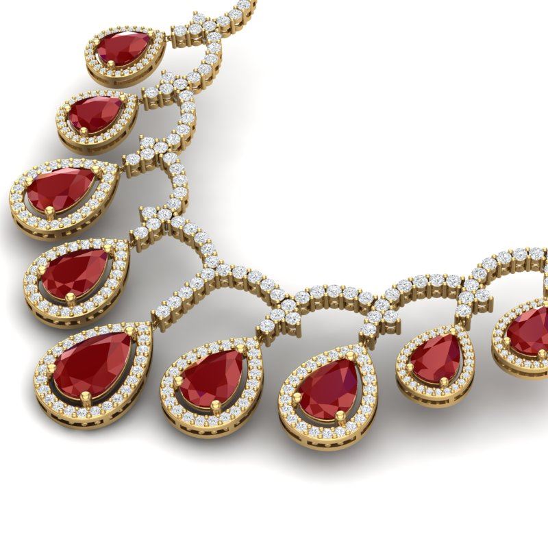 31.5 CTW Royalty Designer Ruby & VS Diamond Necklace 18K Yellow Gold ---- Luxury Designer Brand Necklace Appraised Retail Price at $72,000 ---- SKU Number US39350 18K Yellow gold Necklace Size is 16 Inches, Can custom fit length, Necklace measuring approx. 2 3/4 x 1 1/4 Inches, weighing in total approx. 35 grams. Made in the USA and is stamped 18K, Main stone 4.11 carat total weight containing 1 pieces of Intense Mid-Opaque Red color with AAA quality Pear shape cut Ruby , Stone #2 18.48 carat total weight containing 8 pieces of Intense Mid-Opaque Red color with AAA quality Pear shape cut