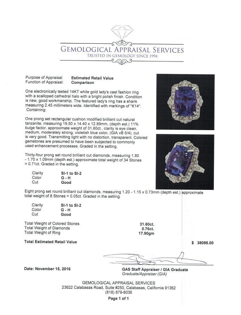 One electronically tested 14KT white gold lady's cast fashion ring with a scalloped cathedral halo with a bright polish finish. The featured lady's ring has a shank measuring 2.45 millimeters wide. Identified with markings of 'K14'. Condition is new, good workmanship. Containing: One prong set rectangular cushion modified brilliant cut natural tanzanite, measuring 19.50 x 14.40 x 12.89mm, (depth est.) 11%. bulge factor, approximate weight of 31.60ct., clarity is eye clean, medium, moderately strong, violetish blue color, (GIA vB 5/4), cut is very good. Transmitting light with no distortion, transparent. Colored gemstones are presumed to have been subjected to commonly used enhancement processes. Graded in the setting. Thirty-Four prong set round brilliant cut diamonds, measuring 1.80 - 1.70 x 1.09mm (depth est.) approximate total weight of 34 Stones = 0.71ct. Graded in the setting. Clarity SI-1 to SI-2. Color: G - H Cut Good Eight prong set round brilliant cut diamonds, measuring 1.20 - 1.15 x 0.73mm (depth est.) approximate total weight of 8 Stones = 0.05ct. Graded in the setting. Clarity SI-1 to SI-2. Color: G - H Cut Good. Total Weight of Colored Stones 31.60ct.. Total Weight of Diamonds 0.76ct.. Total Weight of Ring 17.90gm. GAS Appraised at $38,095.00.