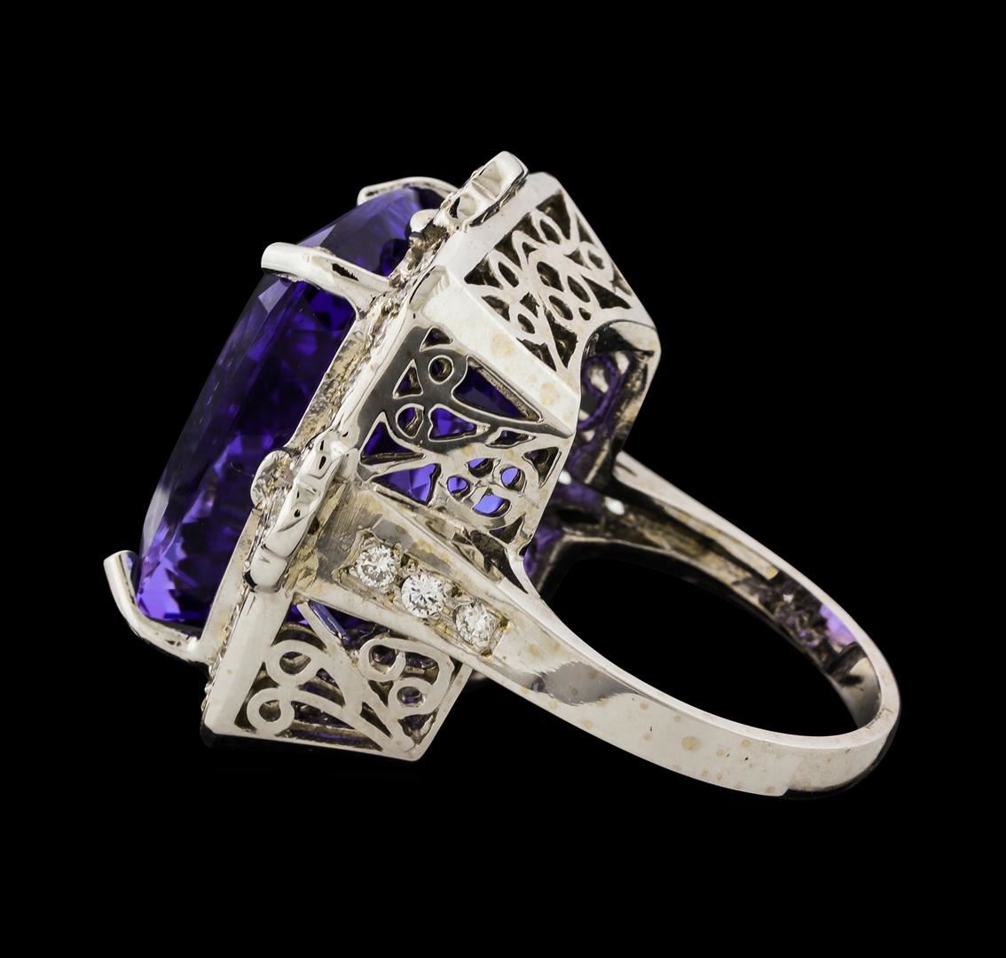 One electronically tested 14KT white gold lady's cast fashion ring with a scalloped cathedral halo with a bright polish finish. The featured lady's ring has a shank measuring 2.45 millimeters wide. Identified with markings of 'K14'. Condition is new, good workmanship. Containing: One prong set rectangular cushion modified brilliant cut natural tanzanite, measuring 19.50 x 14.40 x 12.89mm, (depth est.) 11%. bulge factor, approximate weight of 31.60ct., clarity is eye clean, medium, moderately strong, violetish blue color, (GIA vB 5/4), cut is very good. Transmitting light with no distortion, transparent. Colored gemstones are presumed to have been subjected to commonly used enhancement processes. Graded in the setting. Thirty-Four prong set round brilliant cut diamonds, measuring 1.80 - 1.70 x 1.09mm (depth est.) approximate total weight of 34 Stones = 0.71ct. Graded in the setting. Clarity SI-1 to SI-2. Color: G - H Cut Good Eight prong set round brilliant cut diamonds, measuring 1.20 - 1.15 x 0.73mm (depth est.) approximate total weight of 8 Stones = 0.05ct. Graded in the setting. Clarity SI-1 to SI-2. Color: G - H Cut Good. Total Weight of Colored Stones 31.60ct.. Total Weight of Diamonds 0.76ct.. Total Weight of Ring 17.90gm. GAS Appraised at $38,095.00.