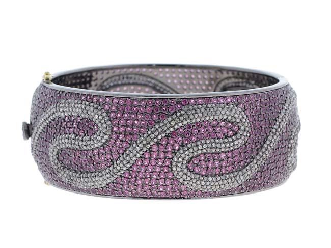 RHODOLITE AND DIAMOND CUFF BANGLE/Diamond Count 1:/Diamond Count 1 TCW:6.25/Diamond Color & Clarity:J-L/I1-I2/Diamond Count 2:/Diamond Count 2 TCW:/Diamond Color & Clarity:/Diamond Count 3:/Diamond Count 3 TCW:/Gemstone Count 1:/Gemstone Count 1 TCW:25.36/Dimension:/Metal Type:14k Gold Yellow Gold /Weight Gram:2.28over 0.925 Silver Sterling Silver /Weight Gram:52.21/Gross Weight:60.82