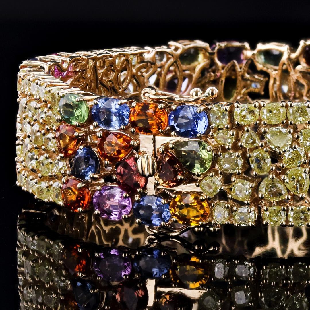 31.68ctw Multi-Color Sapphire and 13.37ctw Diamond 14K Yellow Gold Bracelet. Fourteen karat (14K) yellow gold natural multi color sapphire corundum and fancy color diamond bracelet. Oval, pear, and cushion brilliant cut natural multi color sapphire corundum gemstones are mounted in the center of the bracelet. Fancy light yellow ova!, pear, and cushion brilliant cut diamonds accent the bracelet around and between the center gemstones. The bracelet has a gross weight of 36.1 Grams. NATURAL GEMSTONE GEMSTONE: Sapphire Corundum NATURE: Natural SHAPE: Oval, Pear, Cushion Brilliant, Faceted Cut WEIGHT: 31.68 carat total (58pcs.) DIMENSIONS: 7.2 x 4.0mm CLARITY: Type 2 COLOR: Multi Color (5/5) SYMMETRY: Excellent COLOR INTENSITY: Intense TRANSPARENCY: Transparent TONE: Dark NATURAL DIAMOND SHAPE: Oval, Pear, and Cushion Brilliant Cut WEIGHT: 13.37 carat total (119pcs.) DIMENSIONS: 4.3 x 2.2mm AVERAGE CLARITY: SI1-I1 AVERAGE COLOR: Natural, Fancy Light Yellow SYMMETRY: Excellent POLISH: Excellent METAL METAL: Gold PURITY: 14K COLOR: Yellow CONDITION: Excellent FINISH: High Polish