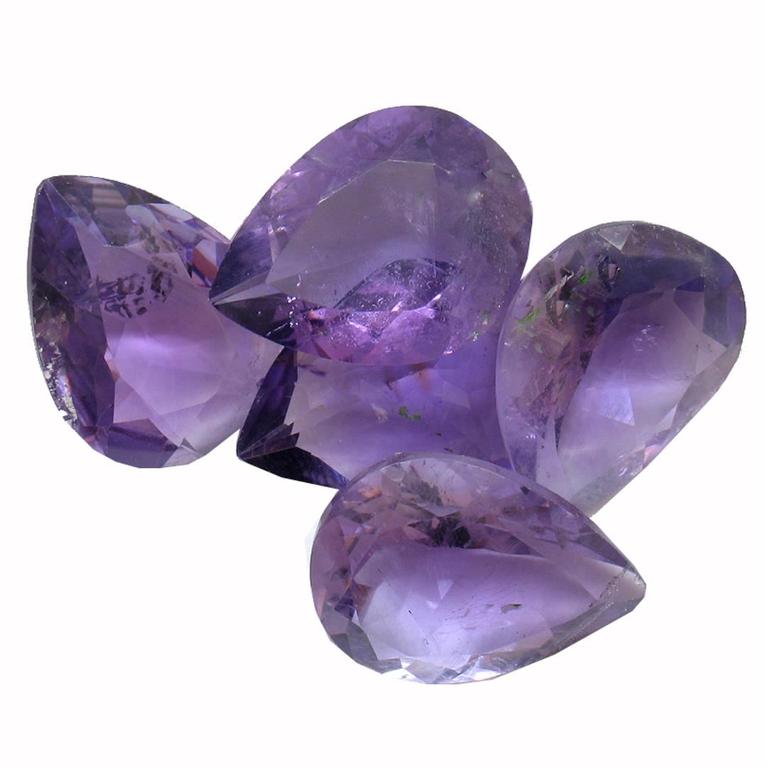 Five pear mixed cut natural amethysts exact total weight 31.60ct., clarity is slightly included, type II, medium dark, very slightly grayish, purple color, (GIA P 6/3), cut is good. Westfield Appraised at $1,095.00.