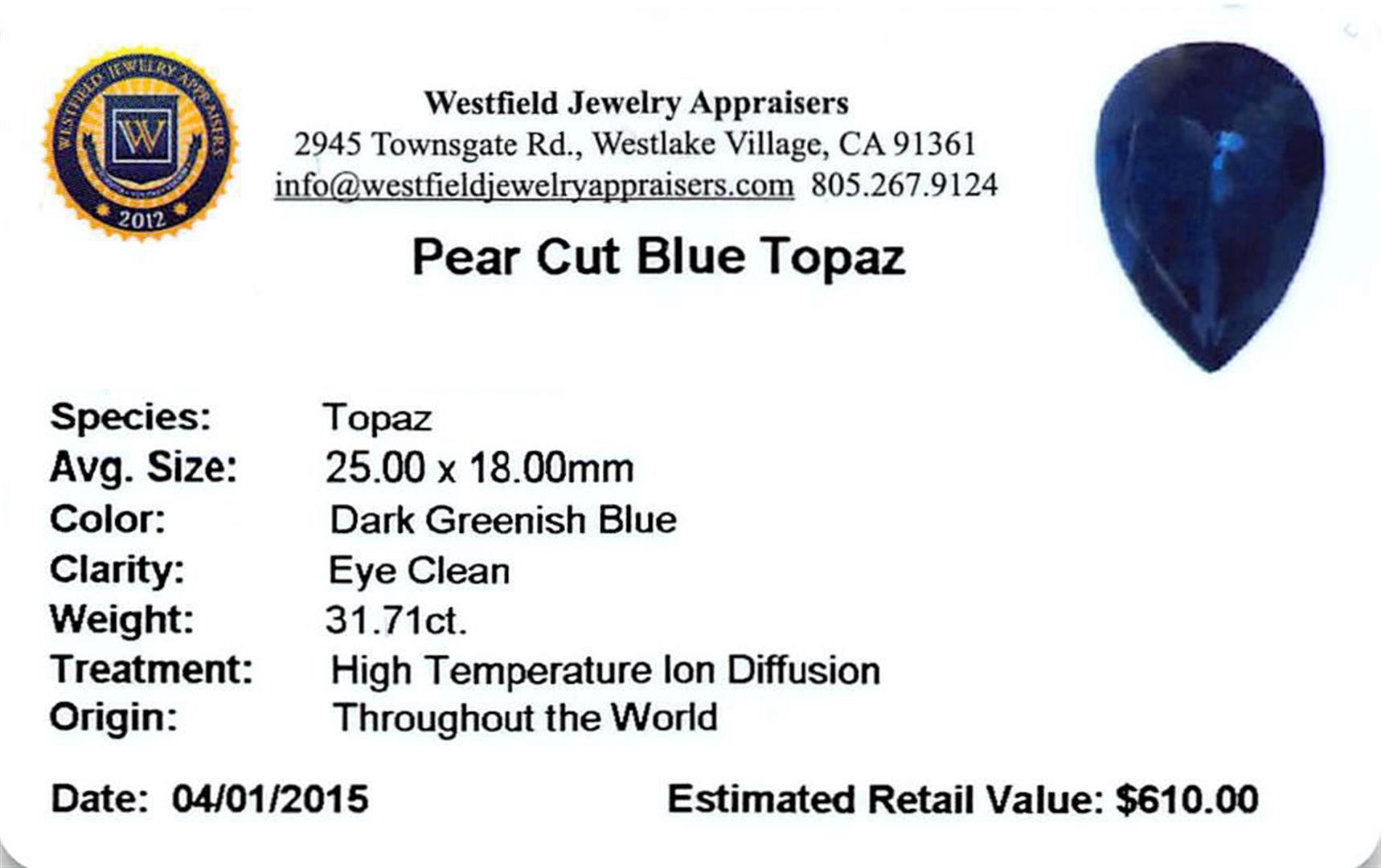 One pear cut natural blue topaz exact weight 31.71ct., clarity is eye clean, type I, dark, very slightly grayish, greenish blue color, (GIA gB 7/3), cut is good. Westfield Appraised at $610.00.