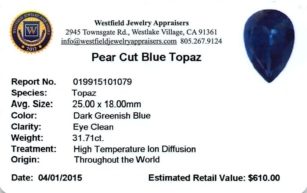 One pear cut natural blue topaz exact weight 31.71ct., clarity is eye clean, type I, dark, very slightly grayish, greenish blue color, (GIA gB 7/3), cut is good. Westfield Appraised at $610.00.