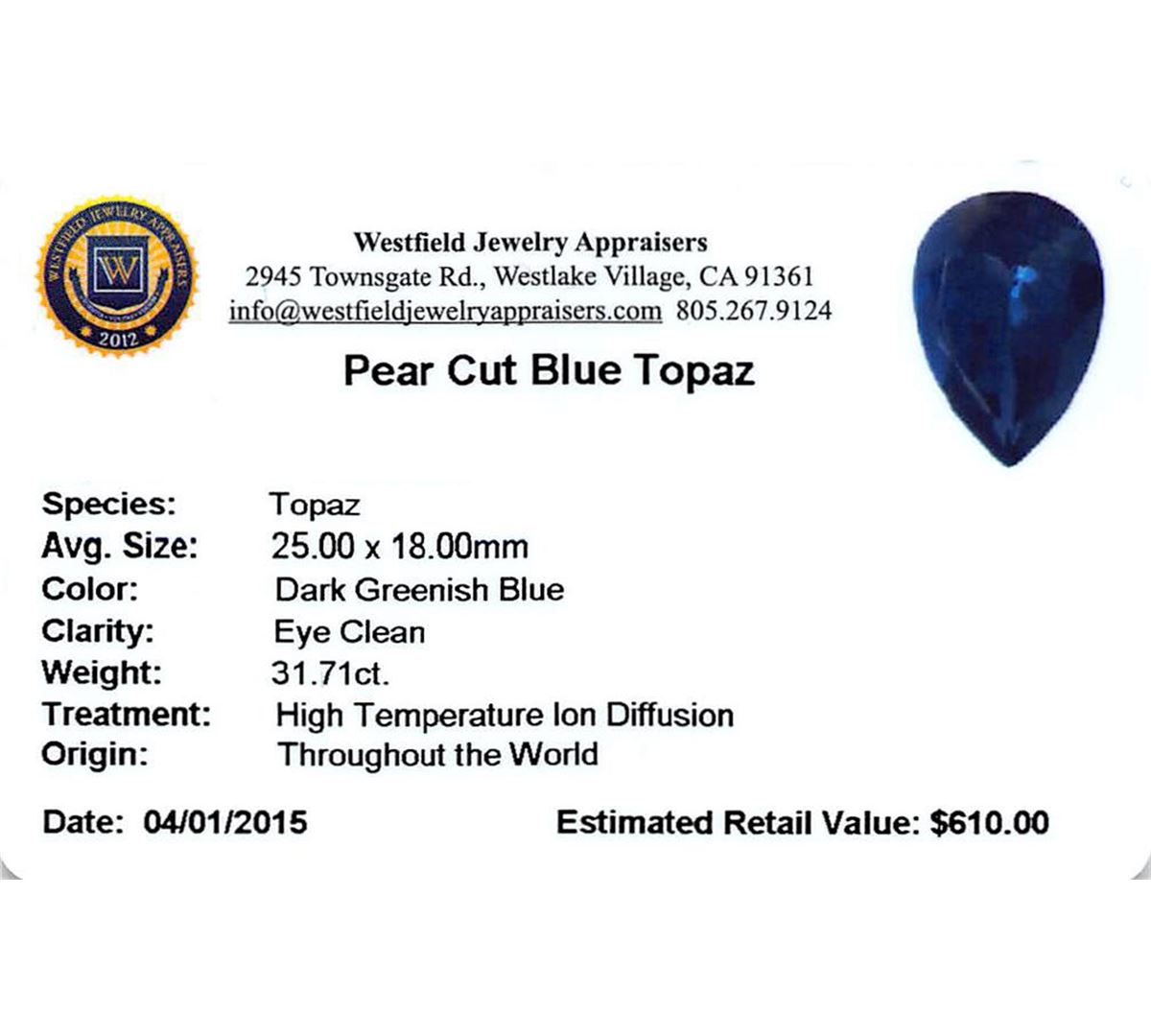 One pear cut natural blue topaz exact weight 31.71ct., clarity is eye clean, type I, dark, very slightly grayish, greenish blue color, (GIA gB 7/3), cut is good. Westfield Appraised at $610.00.