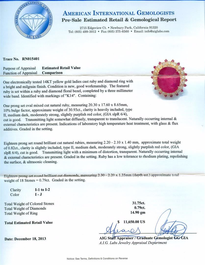 One electronically tested 14KT yellow gold ladies cast ruby and diamond ring with a bright and milgrain finish. The featured ruby is set within a ruby and diamond floral bezel, completed by a three millimeter wide band. Identified with markings of "K14". Condition is new, good workmanship. Containing: One prong set oval mixed cut natural ruby, measuring 20.30 x 17.60 x 8.65mm, 10%. bulge factor, approximate weight of 30.93ct., clarity is heavily included, type II, medium dark, moderately strong, slightly purplish red color, (GIA slpR 6/4), cut is good. Transmitting light somewhat diffusely, transparent to translucent. Naturally occurring internal & external characteristics are present. Indications of laboratory high temperature heat treatment, with glass & flux additives. Graded in the setting. Eighteen prong set round brilliant cut natural rubies, measuring 2.20 - 2.10 x 1.40 mm, approximate total weight of 0.82ct., clarity is slightly included, type II, medium dark, moderately strong, slightly purplish red color, (GIA slpR 6/4), cut is good. Transmitting light with a minimum of distortion, transparent. Naturally occurring internal & external characteristics are present. Graded in the setting. Ruby has a low tolerance to rhodium plating, repolishing the surface, & ultrasonic cleaning. Eighteen prong set round brilliant cut diamonds, measuring 2.30 - 2.20 x 1.35mm (depth est.) approximate total weight of 18 Stones = 0.79ct. Graded in the setting. Clarity: I-1 to I-2. Color: I - J. Total Weight of Colored Stones 31.75ct. Total Weight of Diamonds 0.79ct. Total Weight of Ring 14.90gm. AIG Appraised at $11,650.00.