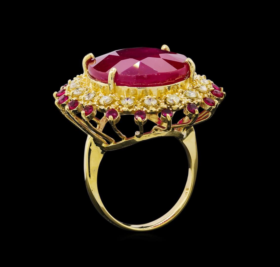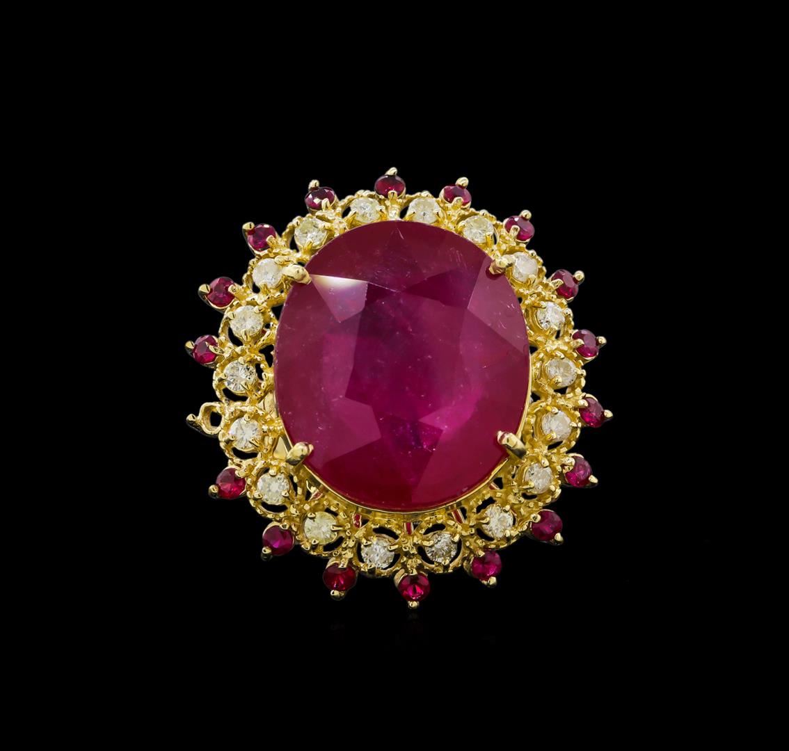 One electronically tested 14KT yellow gold ladies cast ruby and diamond ring with a bright and milgrain finish. The featured ruby is set within a ruby and diamond floral bezel, completed by a three millimeter wide band. Identified with markings of "K14". Condition is new, good workmanship. Containing: One prong set oval mixed cut natural ruby, measuring 20.30 x 17.60 x 8.65mm, 10%. bulge factor, approximate weight of 30.93ct., clarity is heavily included, type II, medium dark, moderately strong, slightly purplish red color, (GIA slpR 6/4), cut is good. Transmitting light somewhat diffusely, transparent to translucent. Naturally occurring internal & external characteristics are present. Indications of laboratory high temperature heat treatment, with glass & flux additives. Graded in the setting. Eighteen prong set round brilliant cut natural rubies, measuring 2.20 - 2.10 x 1.40 mm, approximate total weight of 0.82ct., clarity is slightly included, type II, medium dark, moderately strong, slightly purplish red color, (GIA slpR 6/4), cut is good. Transmitting light with a minimum of distortion, transparent. Naturally occurring internal & external characteristics are present. Graded in the setting. Ruby has a low tolerance to rhodium plating, repolishing the surface, & ultrasonic cleaning. Eighteen prong set round brilliant cut diamonds, measuring 2.30 - 2.20 x 1.35mm (depth est.) approximate total weight of 18 Stones = 0.79ct. Graded in the setting. Clarity: I-1 to I-2. Color: I - J. Total Weight of Colored Stones 31.75ct. Total Weight of Diamonds 0.79ct. Total Weight of Ring 14.90gm. AIG Appraised at $11,650.00.