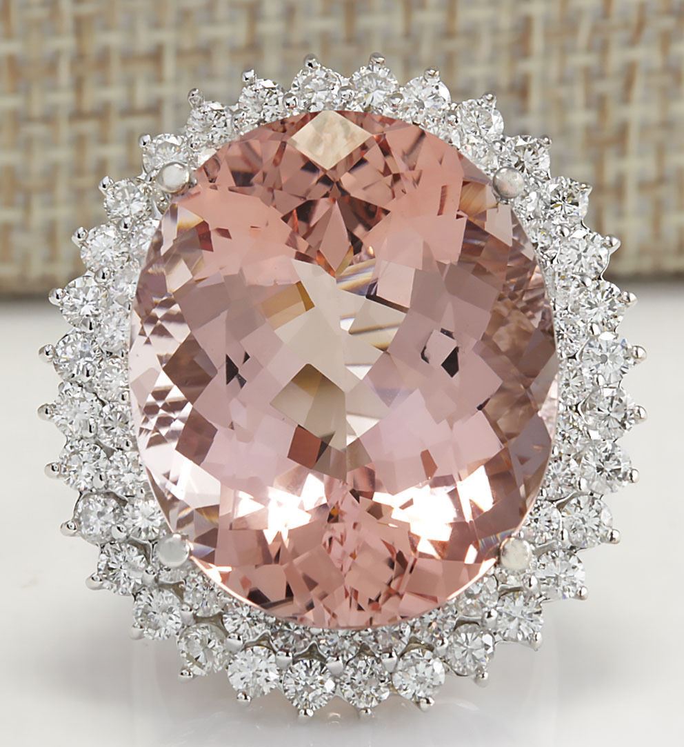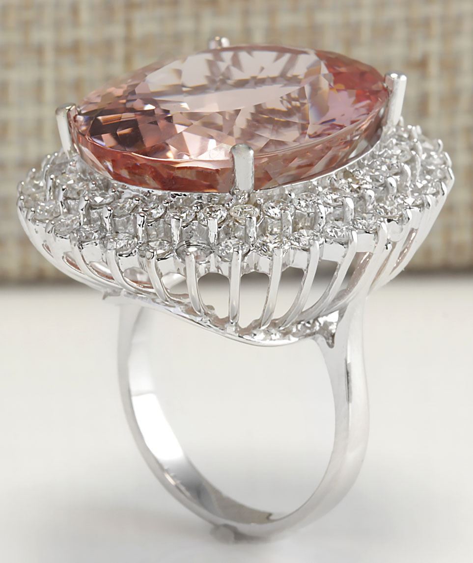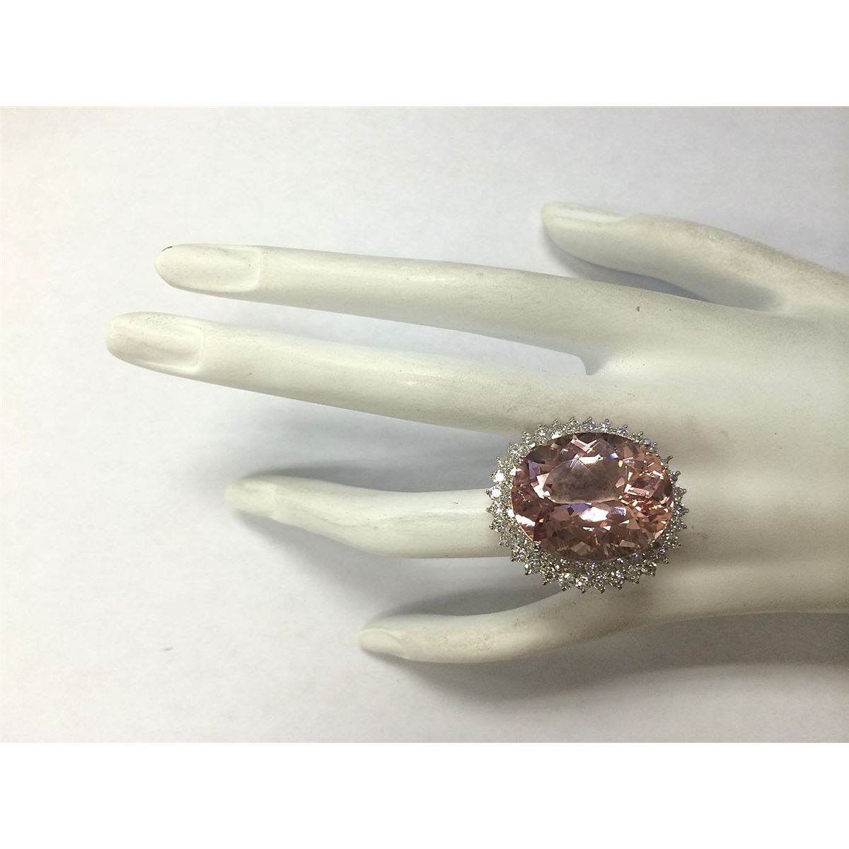 Stamped: 14K Ring Size: 6.75 Total Ring Weight: 16Grams Diamond Weight: Total natural diamond weight is 2.46carat. SI1-SI2 clarity / G-H color Gemstone Weight: Total Natural Peach Morganite Weight is 29.35ctw (Measures: 22.68x18.67mm) Face Measures: 29.80x26.93mm SKU: [703740]