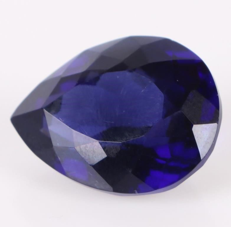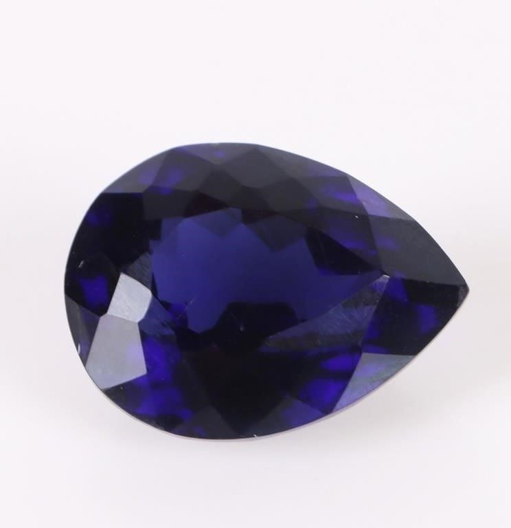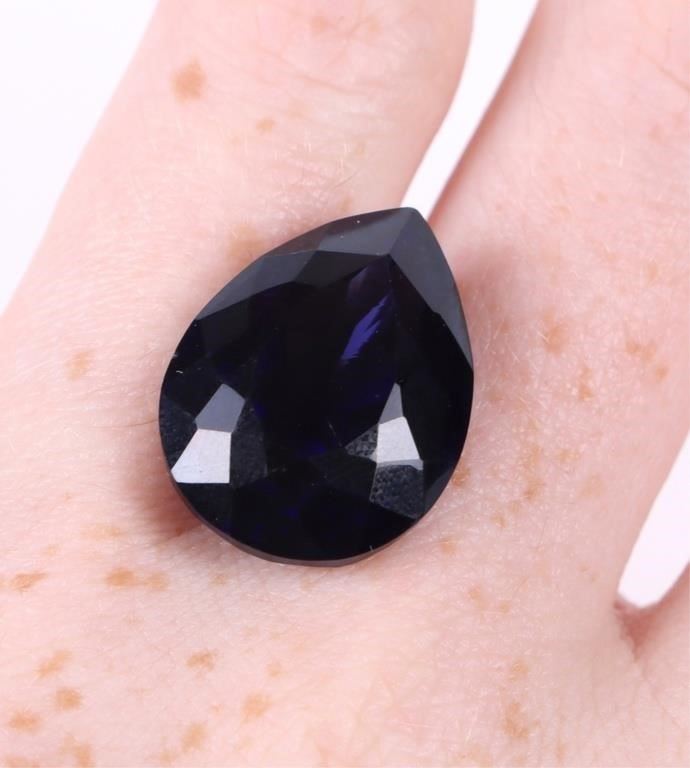 31.90ct large pear-cut dark blue loose sapphire. Stone is electronically tested and identified, tester does not distinguish between natural and lab grown.