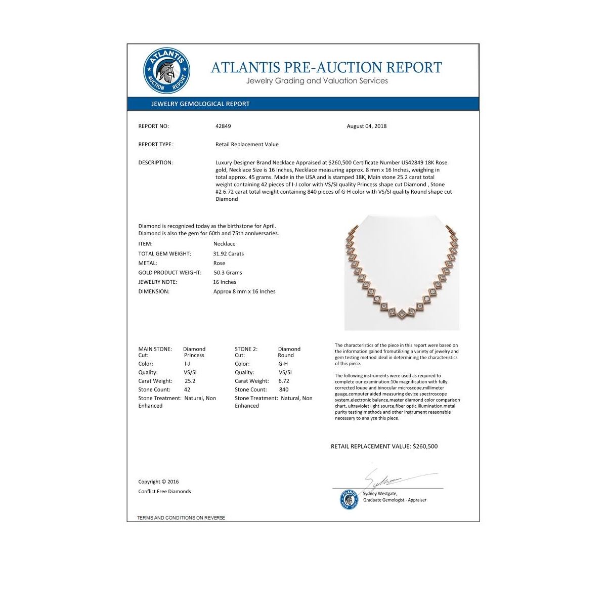 REF-5920H2A -42849 ---- 31.92 CTW Princess Cut Diamond Designer Necklace 18K Rose Gold ---- Luxury Designer Brand Necklace Appraised at $260,500 Certificate Number US42849 18K Rose gold, Necklace Size is 16 Inches, Necklace measuring approx. 8 mm x 16 Inches, weighing in total approx. 45 grams. Made in the USA and is stamped 18K, Main stone 25.2 carat total weight containing 42 pieces of I-J color with VS/SI quality Princess shape cut Diamond , Stone #2 6.72 carat total weight containing 840 pieces of G-H color with VS/SI quality Round shape cut Diamond