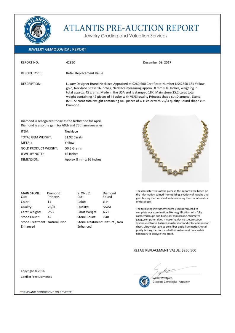 REF-5920A2X -42850 ---- 31.92 CTW Princess Cut Diamond Designer Necklace 18K Yellow Gold ---- Luxury Designer Brand Necklace Appraised at $260,500 Certificate Number US42850 18K Yellow gold, Necklace Size is 16 Inches, Necklace measuring approx. 8 mm x 16 Inches, weighing in total approx. 45 grams. Made in the USA and is stamped 18K, Main stone 25.2 carat total weight containing 42 pieces of I-J color with VS/SI quality Princess shape cut Diamond , Stone #2 6.72 carat total weight containing 840 pieces of G-H color with VS/SI quality Round shape cut Diamond