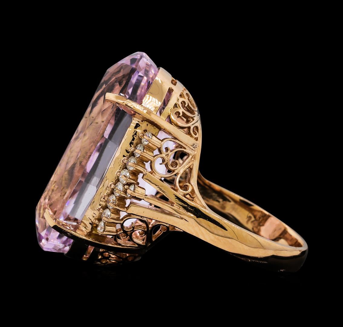 One electronically tested 14KT rose gold lady's cast fashion ring with a bright polish finish. The featured lady's ring has diamond encrusted shoulders and a shank measuring 3.20 millimeters wide. Identified with markings of '14K'. Condition is new, good workmanship. Containing: One prong set oval modified brilliant cut natural kunzite, measuring 25.90 x 13.65 x 11.75mm, (depth est.) 15%. bulge factor, approximate weight of 31.94ct., clarity is eye clean, medium light, moderately strong, reddish purple color, (GIA rP 4/4), cut is very good. Transmitting light with no distortion, transparent. Colored gemstones are presumed to have been subjected to commonly used enhancement processes. Graded in the setting. Eighteen prong set round brilliant cut diamonds, measuring 1.75 - 1.65 x 1.04mm (depth est.) approximate total weight of 18 Stones = 0.33ct. Graded in the setting. Clarity SI-1 to SI-2. Color: H - I Cut Good. Total Weight of Colored Stones 31.94ct.. Total Weight of Diamonds 0.33ct.. Total Weight of Ring 13.10gm. GAS Appraised at $12,130.00.