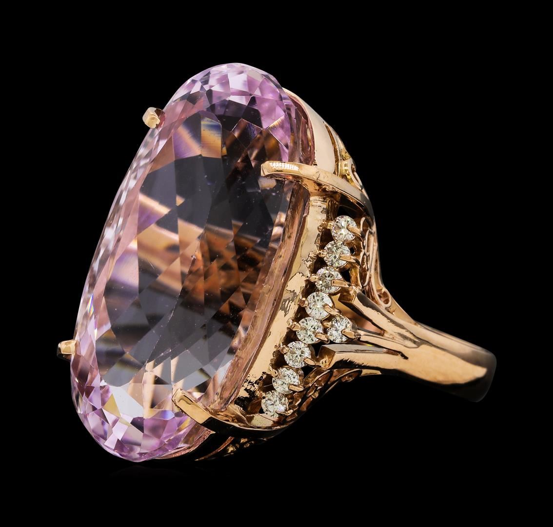 One electronically tested 14KT rose gold lady's cast fashion ring with a bright polish finish. The featured lady's ring has diamond encrusted shoulders and a shank measuring 3.20 millimeters wide. Identified with markings of '14K'. Condition is new, good workmanship. Containing: One prong set oval modified brilliant cut natural kunzite, measuring 25.90 x 13.65 x 11.75mm, (depth est.) 15%. bulge factor, approximate weight of 31.94ct., clarity is eye clean, medium light, moderately strong, reddish purple color, (GIA rP 4/4), cut is very good. Transmitting light with no distortion, transparent. Colored gemstones are presumed to have been subjected to commonly used enhancement processes. Graded in the setting. Eighteen prong set round brilliant cut diamonds, measuring 1.75 - 1.65 x 1.04mm (depth est.) approximate total weight of 18 Stones = 0.33ct. Graded in the setting. Clarity SI-1 to SI-2. Color: H - I Cut Good. Total Weight of Colored Stones 31.94ct.. Total Weight of Diamonds 0.33ct.. Total Weight of Ring 13.10gm. GAS Appraised at $12,130.00.