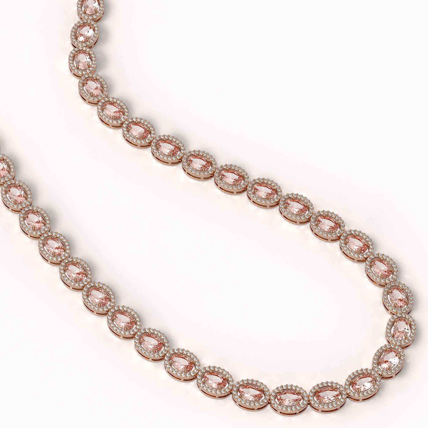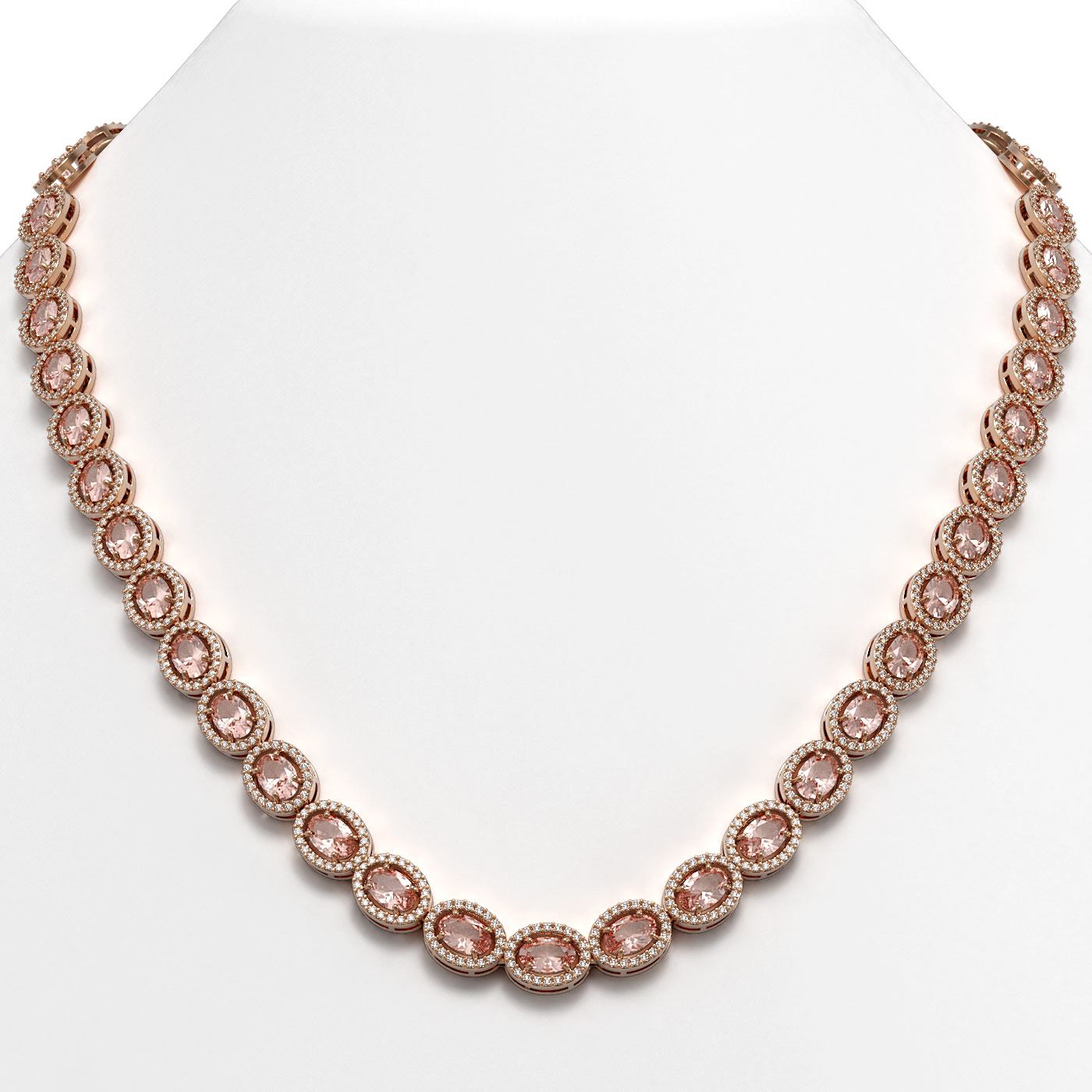 REF-604M2H -40413 ---- 31.96 CTW Morganite & Diamond Halo Necklace 10K Rose Gold ---- Luxury Designer Brand Necklace Appraised at $33,200 Certificate Number US40413 10k Rose gold, Necklace Size is 16 Inches, Necklace measuring approx. 8 mm x 16 Inches, weighing in total approx. 29 grams. Made in the USA and is stamped 10k, Main stone 25.8 carat total weight containing 43 pieces of Intense Violet Blue color with AAA quality Oval shape cut Morganite , Stone #2 6.16 carat total weight containing 860 pieces of G-H color with VS/SI quality Round shape cut Diamond