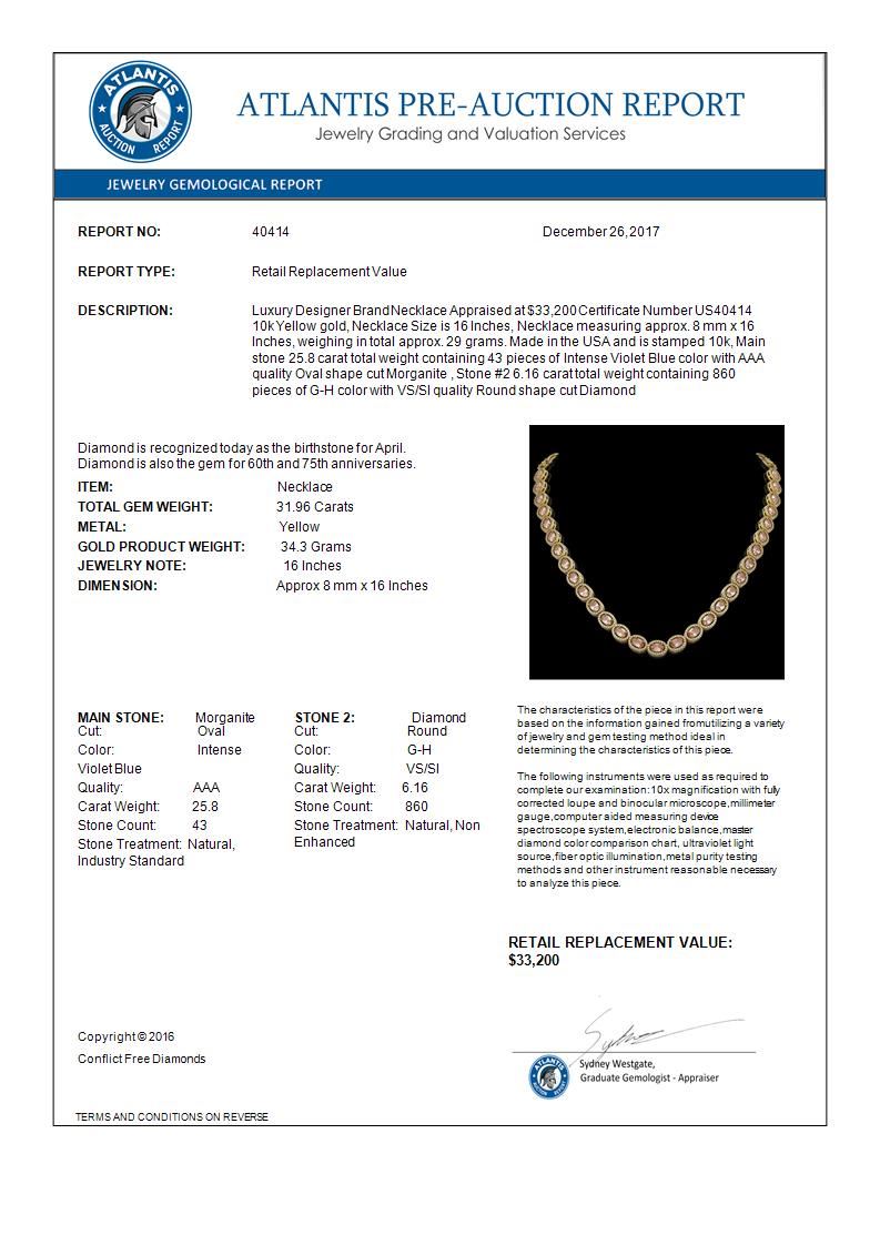 REF-604W2F -40414 ---- 31.96 CTW Morganite & Diamond Halo Necklace 10K Yellow Gold ---- Luxury Designer Brand Necklace Appraised at $33,200 Certificate Number US40414 10k Yellow gold, Necklace Size is 16 Inches, Necklace measuring approx. 8 mm x 16 Inches, weighing in total approx. 29 grams. Made in the USA and is stamped 10k, Main stone 25.8 carat total weight containing 43 pieces of Intense Violet Blue color with AAA quality Oval shape cut Morganite , Stone #2 6.16 carat total weight containing 860 pieces of G-H color with VS/SI quality Round shape cut Diamond