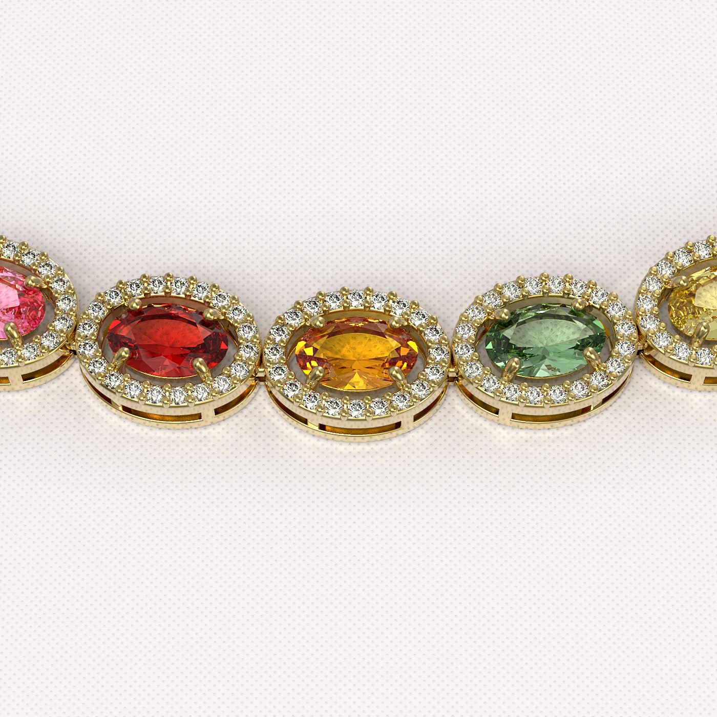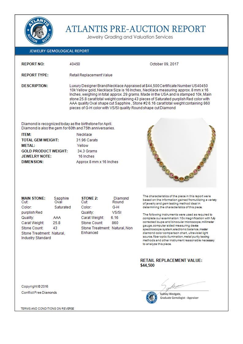 40450 - REF-674V4Y ---- 31.96 CTW Multi Color Sapphire & Diamond Necklace 10K Yellow Gold ---- Luxury Designer Brand Necklace Appraised at $44,500 Certificate Number US40450  10k Yellow gold,  Necklace Size is 16 Inches, Necklace measuring approx. 8 mm x 16 Inches, weighing in total approx. 29 grams. Made in the USA and is stamped 10k, Main stone 25.8 carat total weight containing 43 pieces of Saturated purplish Red color with AAA quality Oval shape cut Sapphire , Stone #2 6.16 carat total weight containing 860 pieces of G-H color with  VS/SI quality Round shape cut Diamond