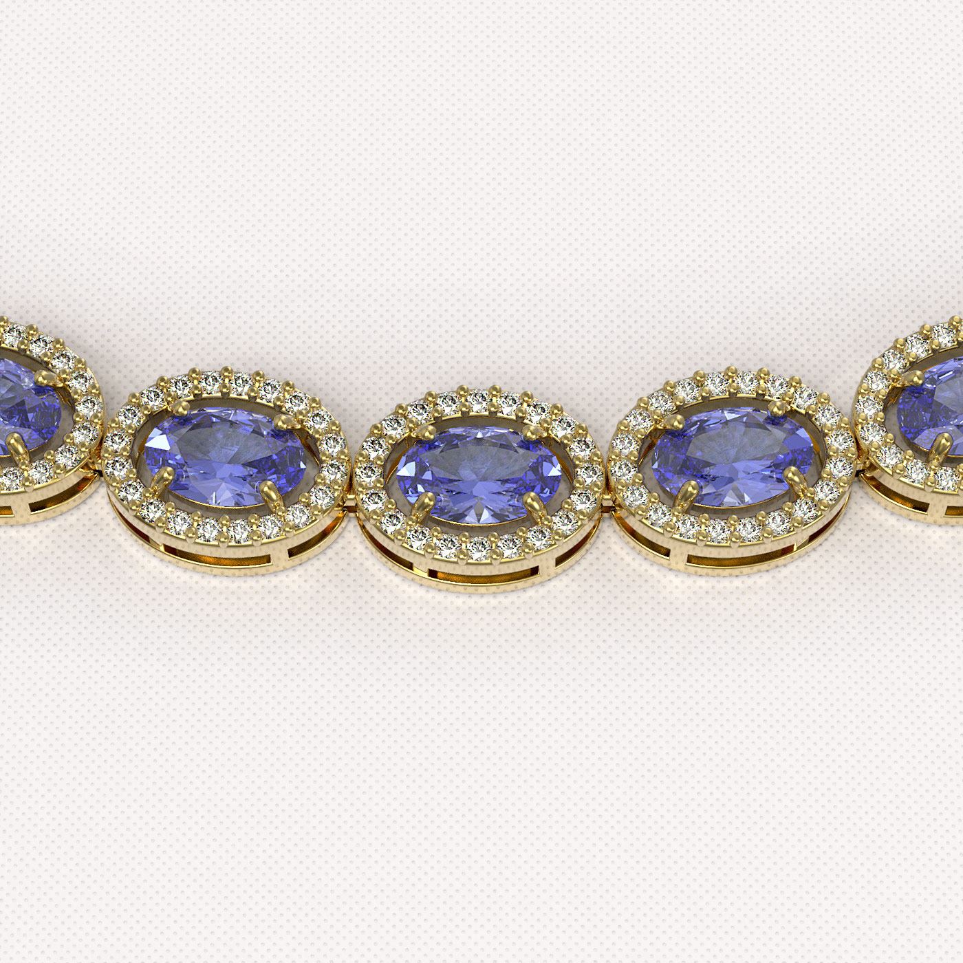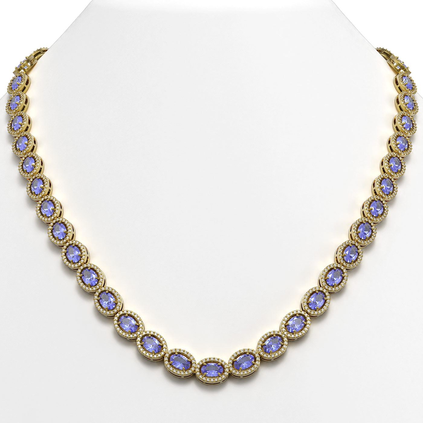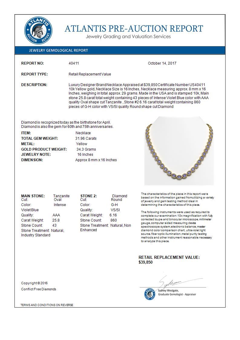 40411 - REF-604M2F ---- 31.96 CTW Tanzanite & Diamond Necklace Yellow Gold 10K Yellow Gold ---- Luxury Designer Brand Necklace Appraised at $39,850 Certificate Number US40411 10k Yellow gold, Necklace Size is 16 Inches, Necklace measuring approx. 8 mm x 16 Inches, weighing in total approx. 29 grams. Made in the USA and is stamped 10k, Main stone 25.8 carat total weight containing 43 pieces of Intense Violet Blue color with AAA quality Oval shape cut Tanzanite , Stone #2 6.16 carat total weight containing 860 pieces of G-H color with VS/SI quality Round shape cut Diamond