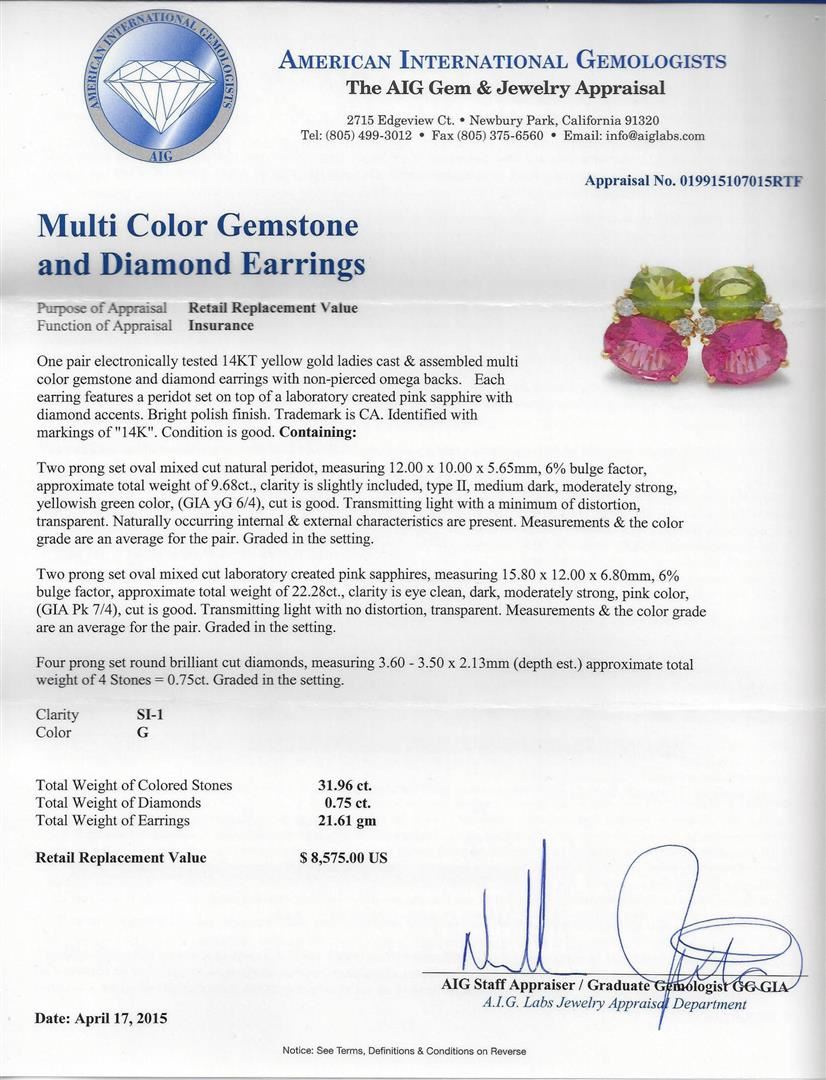 One pair electronically tested 14KT yellow gold ladies cast & assembled multi color gemstone and diamond earrings with non-pierced omega backs. Each earring features a peridot set on top of a laboratory created pink sapphire with diamond accents. Bright polish finish. Trademark is CA. Condition is good. Containing: Two prong set oval mixed cut natural peridot, measuring 12.00 x 10.00 x 5.65mm, 6% bulge factor, approximate total weight of 9.68ct., clarity is slightly included, type II, medium dark, moderately strong, yellowish green color, (GIA yG 6/4), cut is good. Transmitting light with a minimum of distortion, transparent. Naturally occurring internal & external characteristics are present. Measurements & the color grade are an average for the pair. Graded in the setting. Two prong set oval mixed cut laboratory created pink sapphires, measuring 15.80 x 12.00 x 6.80mm, 6% bulge factor, approximate total weight of 22.28ct., clarity is eye clean, dark, moderately strong, pink color, (GIA Pk 7/4), cut is good. Transmitting light with no distortion, transparent. Measurements & the color grade are an average for the pair. Graded in the setting. Four prong set round brilliant cut diamonds, measuring 3.60 - 3.50 x 2.13mm (depth est.) approximate total weight of 4 Stones = 0.75ct. Graded in the setting. Clarity: SI-1. Color: G. Total Weight of Colored Stones: 31.96 ct. Total Weight of Diamonds: 0.75 ct. Total Weight of Earrings: 21.61 gm. AIG Appraised at $8,575.00.