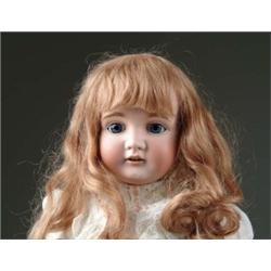31” KESTNER INCISED “MADE IN GERMANY M 16 164.” Doll has blue glass sleep eyes, four upper teeth, on fully articulated Kestner body with original finish stamped “GERMANY 6 1/2.” Wearing a period white cotton dress with lace trim, pink ribbon inserts, antique underwear, white cotton socks, and white leather baby booties. An ash-blond human hair wig is over plaster pate. CONDITION: Good quality bisque, upper eyelids rewaxed. RS 1-4434 (500-700)