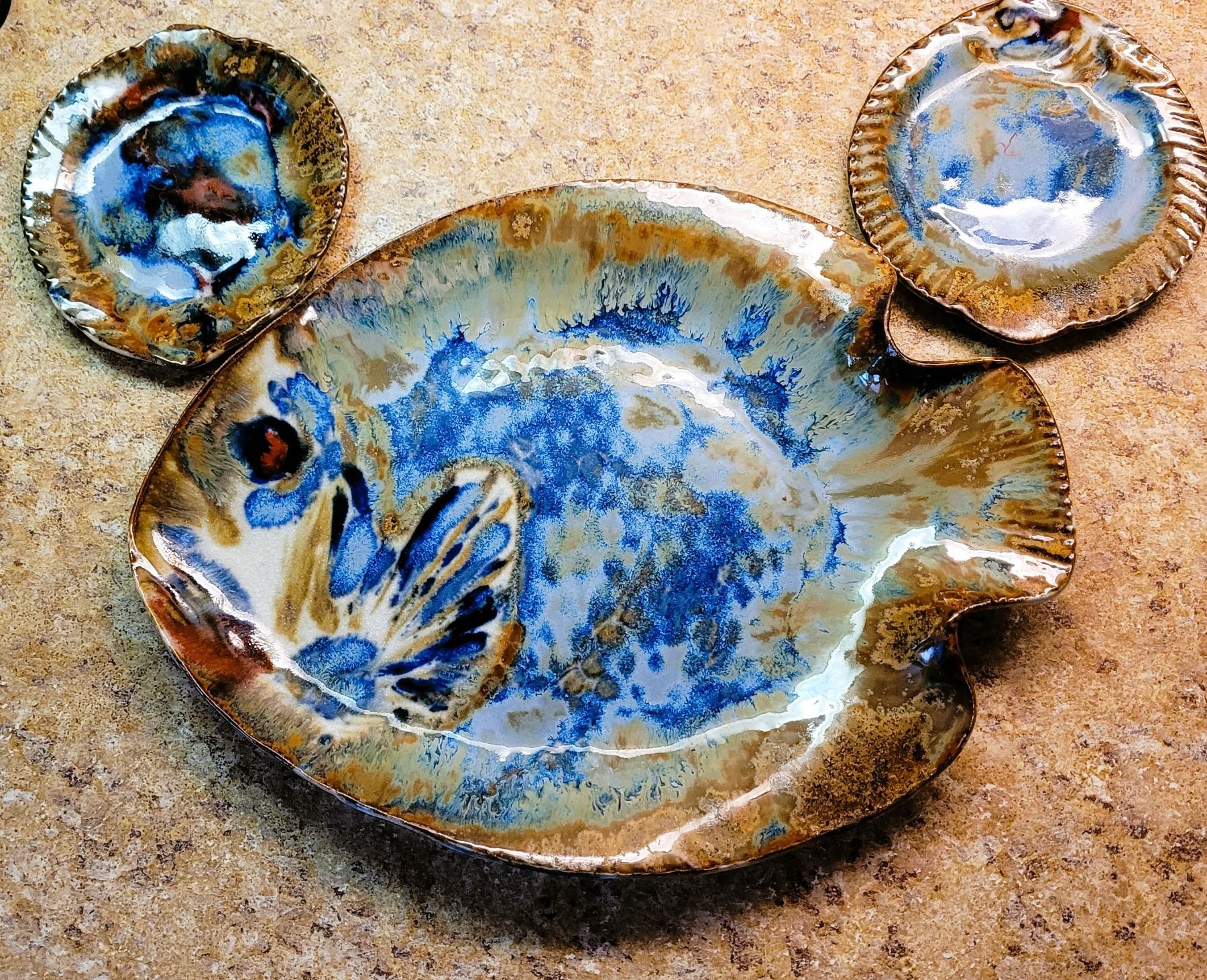 13" FISH PLATTER AND 2 MATCHING 5" SIDE DISHES. HOUSEHOLD
