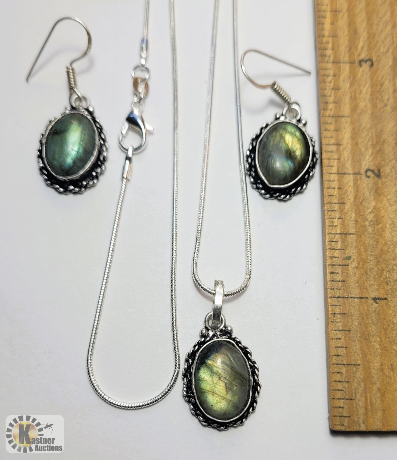 AND MATCHING PENDANT ON 20" SILVER PLATED CHAIN, ALL SETTINGS ARE STAMPED 925 SILVER PLATE. JEWELLERY