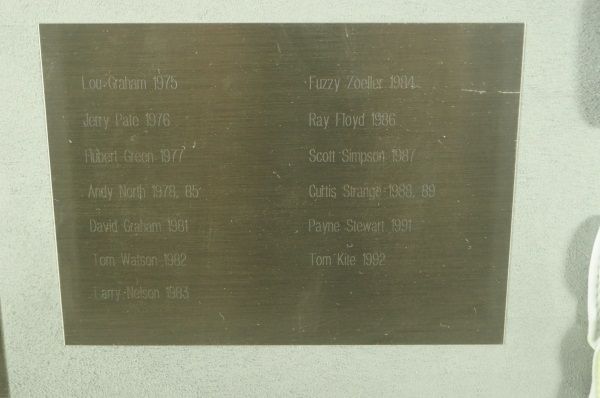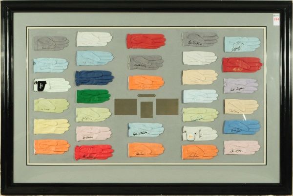 In large frame, 31 gloves total. Tom Kite, Hale Irwin, Scott Simpson, Curtis Strange, Byron Nelson, Gene Sarengen, Payne Stewart, Johnny Miller, and many more. Frame measures 78" x 48".