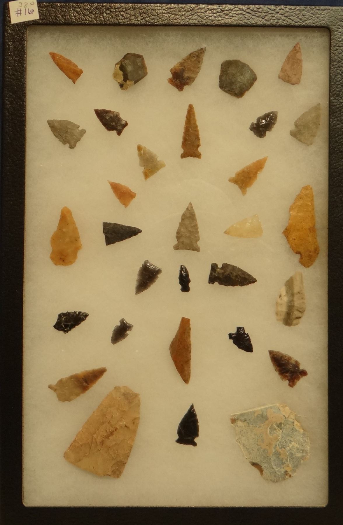 31 artifacts in 8”x 12”x1” frame, includes 4 scrapers, 1 awl, 5 knives, 23 arrowheads