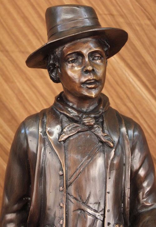 He Is An Iconic American Outlaw And Symbol Of The American Old West. Known By Many Names, Henry Antrim, And William H. Bonney; After His Death In 1881, Billy The Kid Became A Household Name. He Was A 19Th Century American Frontier Outlaw And Gunman Who Participated In The Lincoln County War. Legend Claims He Killed 21 Men But That Number May Have Been Inflated To Fit His Post-Mortem Persona. He Was Killed By A Sheriff When He Was Just 21 But History Made Billy Immortal In American History. He Stands In His Slacks, Shirt Tucked In With A Short Coat And Slacks Tucked Into His Knee-High Boots. He Holds His Trusty Gun In Front Of Him, Butt On The Ground. His Face Is Alive And Alert, As If Expecting Trouble, Which He Always Found. This Brown Patina Sculpture Was Cast Using The "Lost Wax Method" And Mounted On A Marble Base. Bronze Dimensions With Marble Base: Height 31 X Width 11 inches. Weight: 35 Lbs.