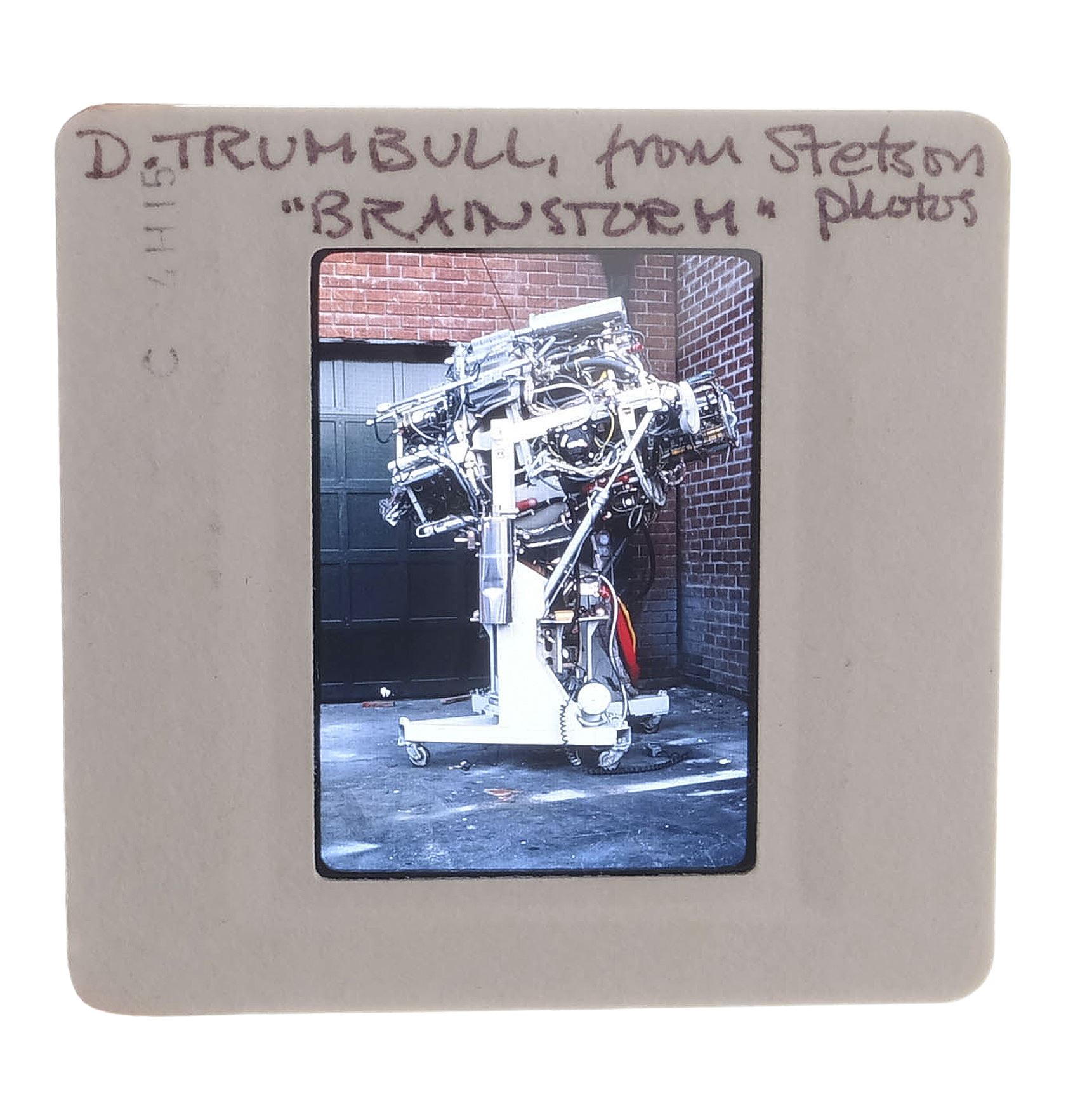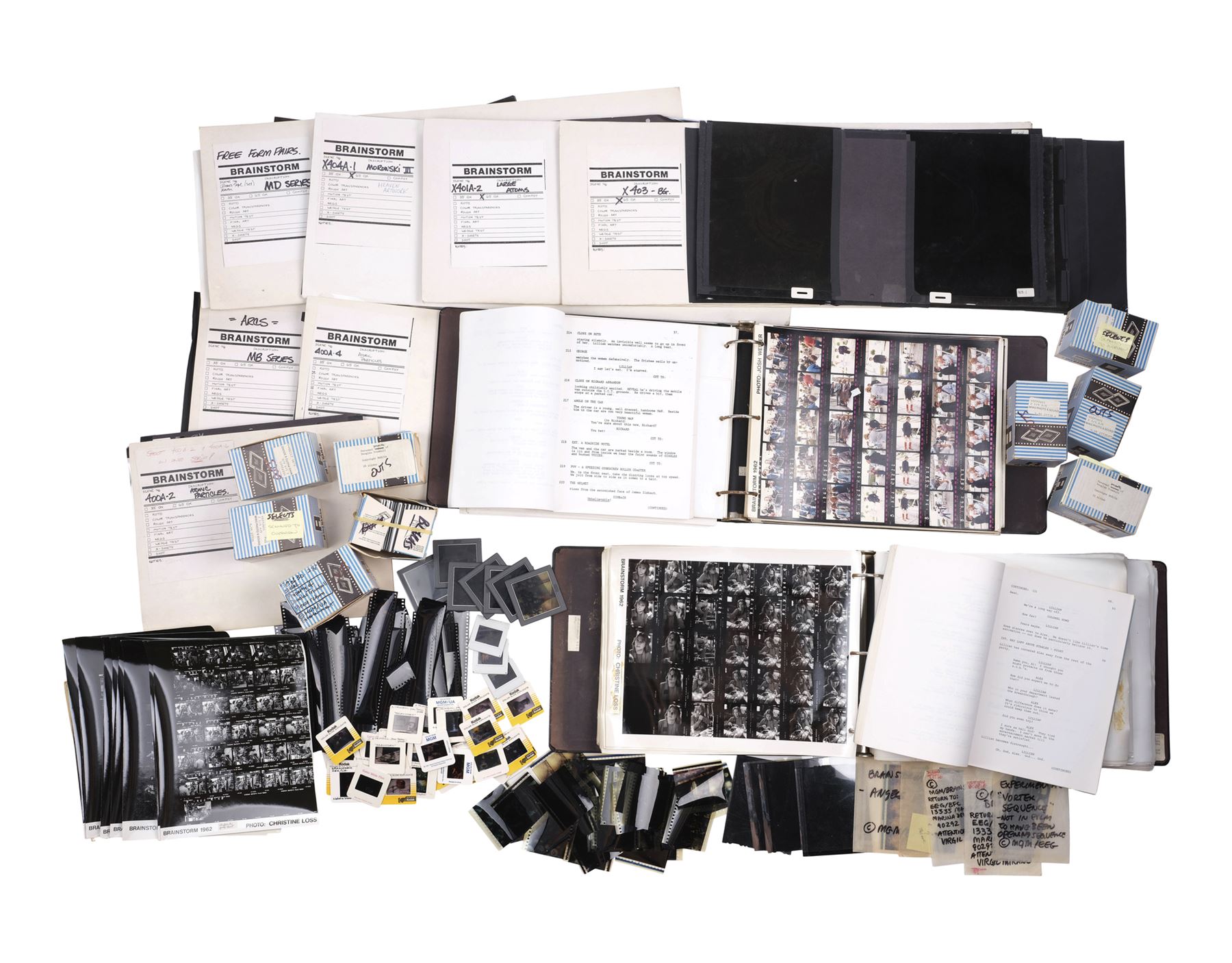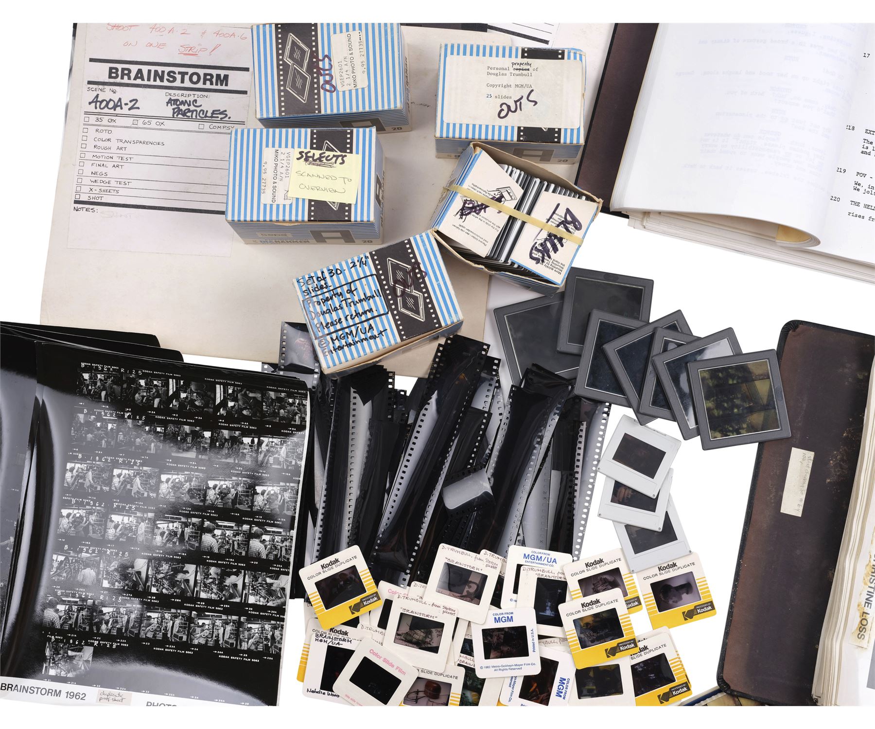 This lot comes from the collection of the director and special photographic effects artist Douglas Trumbull. This lot consists of two scripts, one "polish draft" with "tentative title" for Brainstorm and a revised draft for "The Dunlap Tape" with 144 pages each. Also included are two binders with 117- and 132-pages of film stills and an additional 106-pages of stills; 225 slides; 59 SFX transparency sheets; 65 extended SFX transparency sheets; additional 41 loose slides; an additional 114 loose transparent film stills; and 46 film strips. This lot exhibits tearing, discoloration, stickiness between the transparencies, and a buildup of grime. Dimensions: (largest) 28.5" x 12" (72.5 cm x 30.5 cm)Visual effects pioneer Douglas Trumbull was born in Los Angeles in 1942. After abandoning architecture for technical drawing and cartooning, his talent for photorealism soon earned him work at Graphic Films, an esteemed Hollywood studio for which he designed groundbreaking cosmic effects for the 1964 New York World's Fair. After seeing Trumbull's work, director Stanley Kubrick hired him to create animations and VFX shots - including the iconic Star Gate sequence - for what would become his seminal masterpiece 2001: A Space Odyssey. From that film's success, Trumbull became one of the industry's most trusted photographic effects experts, designing and producing legendary screen moments in such sci-fi landmarks as Close Encounters of the Third Kind, Star Trek: The Motion Picture, and Blade Runner, all three of which earned him Academy Award& reg; nominations. In addition to directing the cult classics Silent Running and Brainstorm, Trumbull later received a Scientific and Engineering Award for his high-speed photography process Showscan in 1993, one of two specialty awards given to him by the Academy of Motion Picture Arts and Sciences before his death in 2022. 60 years since he first made his mark on global cinema, Propstore today celebrates Douglas Trumbull by presenting a selection of rare memorabilia from his personal collection to the public.