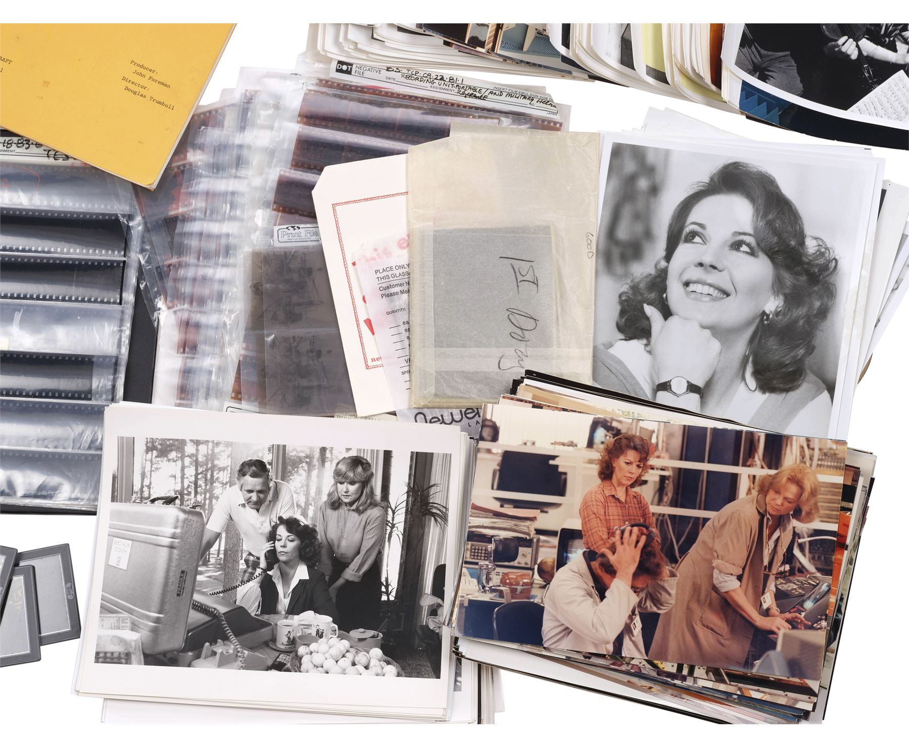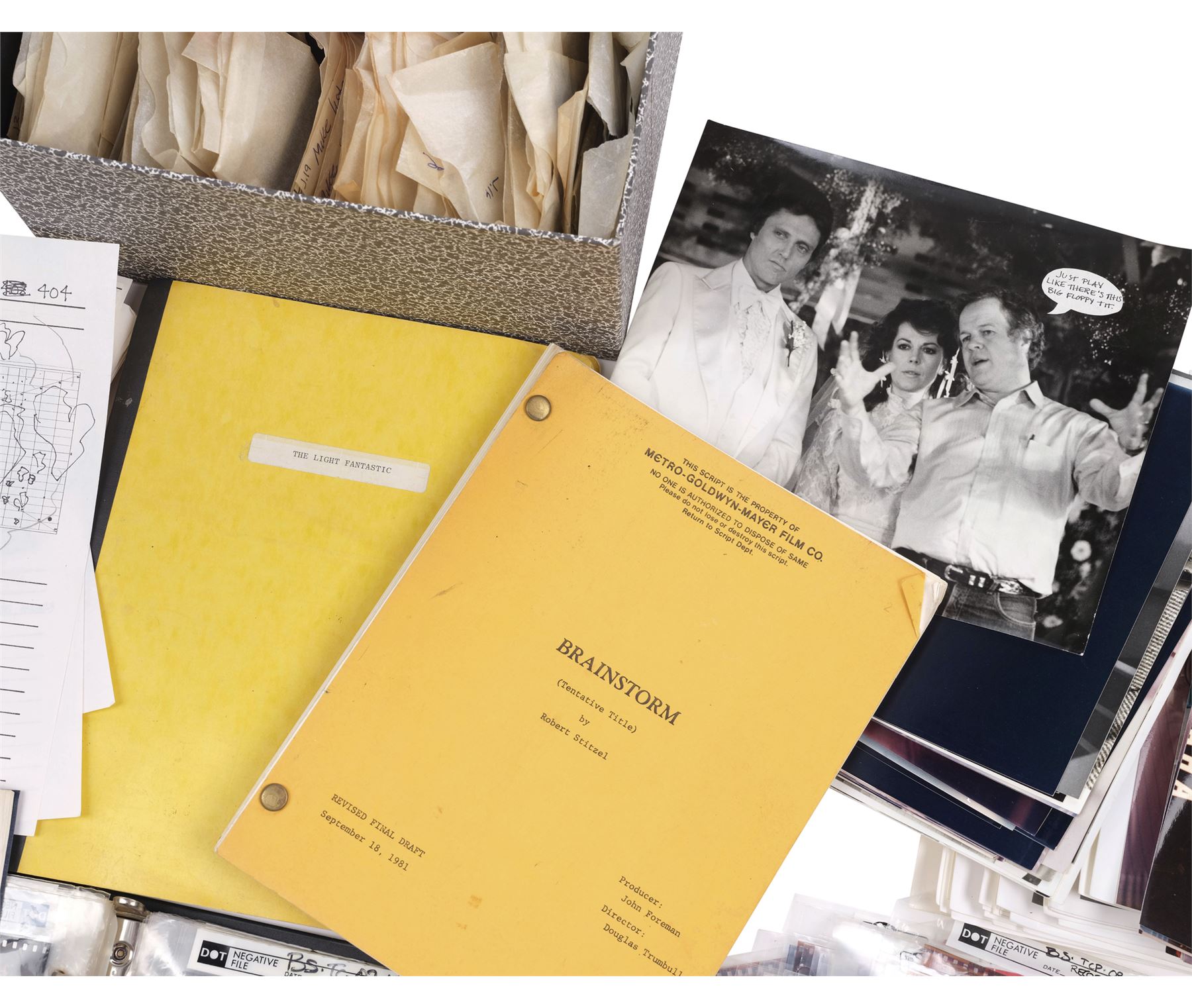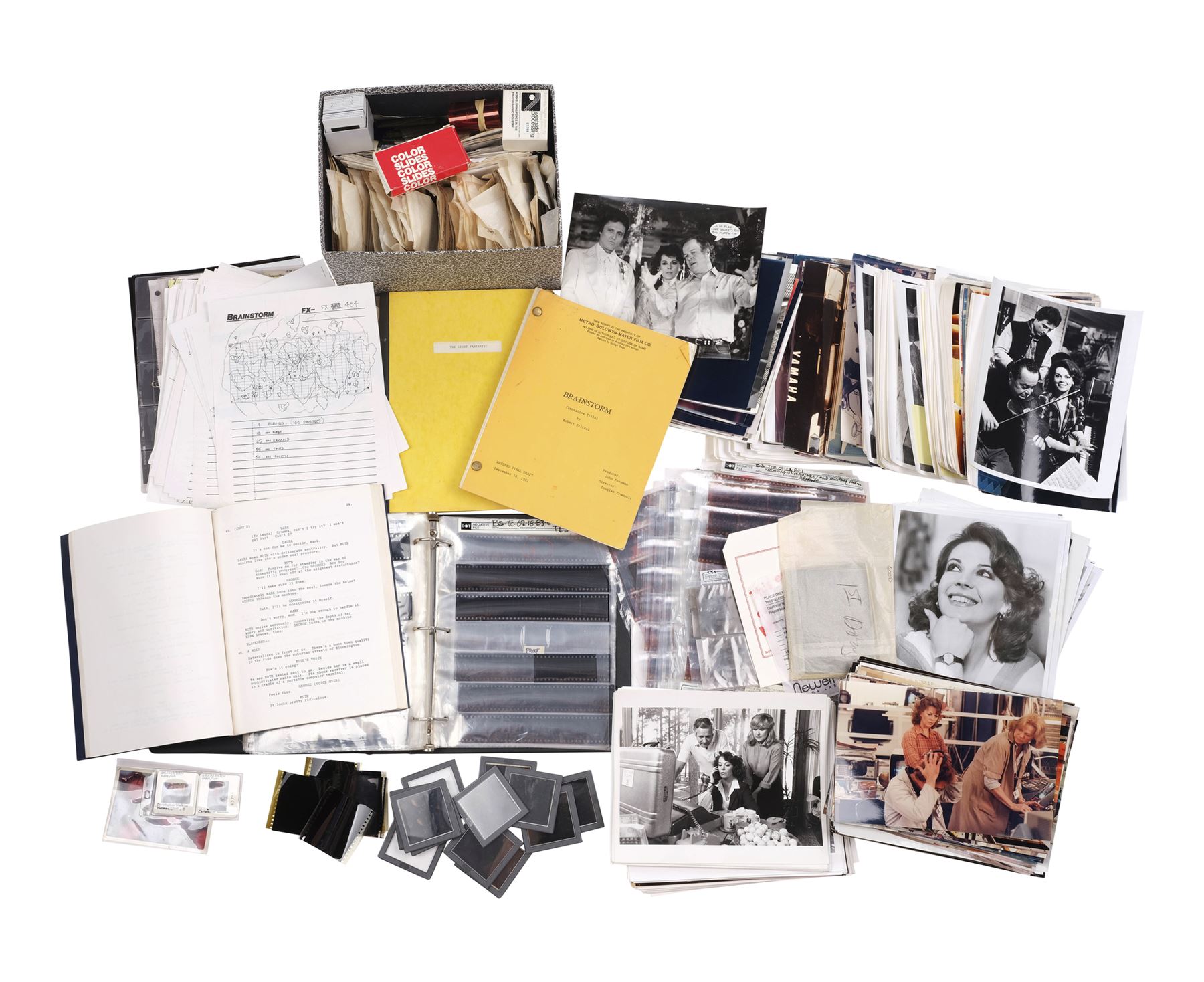 This lot comes from the collection of the director and special photographic effects artist Douglas Trumbull. This lot consists of 419 photographs in black-and-white and color with hand-written captions on the back; one final 135-page draft "Brainstorm" script; one 135-page script for "The George Dunlap Tape"; one 124-page script for "The Light Fantastic"; 44 behind-the-scenes slides with an additional two small boxes; one binder with 63 pages of photo negatives; 40 additional pages of negatives; an additional 125 envelopes of negatives and transparencies; 116 pages of storyboard prints; and an additional seven sheets of film strips and photos. This lot exhibits curled edges on the photographs, pin holes, discoloration, creases, stickiness between the negatives, and brittle paper. Dimensions: (approx) 12" x 10" x 11" (30.5 cm x 25.5 cm x 28 cm)Visual effects pioneer Douglas Trumbull was born in Los Angeles in 1942. After abandoning architecture for technical drawing and cartooning, his talent for photorealism soon earned him work at Graphic Films, an esteemed Hollywood studio for which he designed groundbreaking cosmic effects for the 1964 New York World's Fair. After seeing Trumbull's work, director Stanley Kubrick hired him to create animations and VFX shots - including the iconic Star Gate sequence - for what would become his seminal masterpiece 2001: A Space Odyssey. From that film's success, Trumbull became one of the industry's most trusted photographic effects experts, designing and producing legendary screen moments in such sci-fi landmarks as Close Encounters of the Third Kind, Star Trek: The Motion Picture, and Blade Runner, all three of which earned him Academy Award& reg; nominations. In addition to directing the cult classics Silent Running and Brainstorm, Trumbull later received a Scientific and Engineering Award for his high-speed photography process Showscan in 1993, one of two specialty awards given to him by the Academy of Motion Picture Arts and Sciences before his death in 2022. 60 years since he first made his mark on global cinema, Propstore today celebrates Douglas Trumbull by presenting a selection of rare memorabilia from his personal collection to the public.