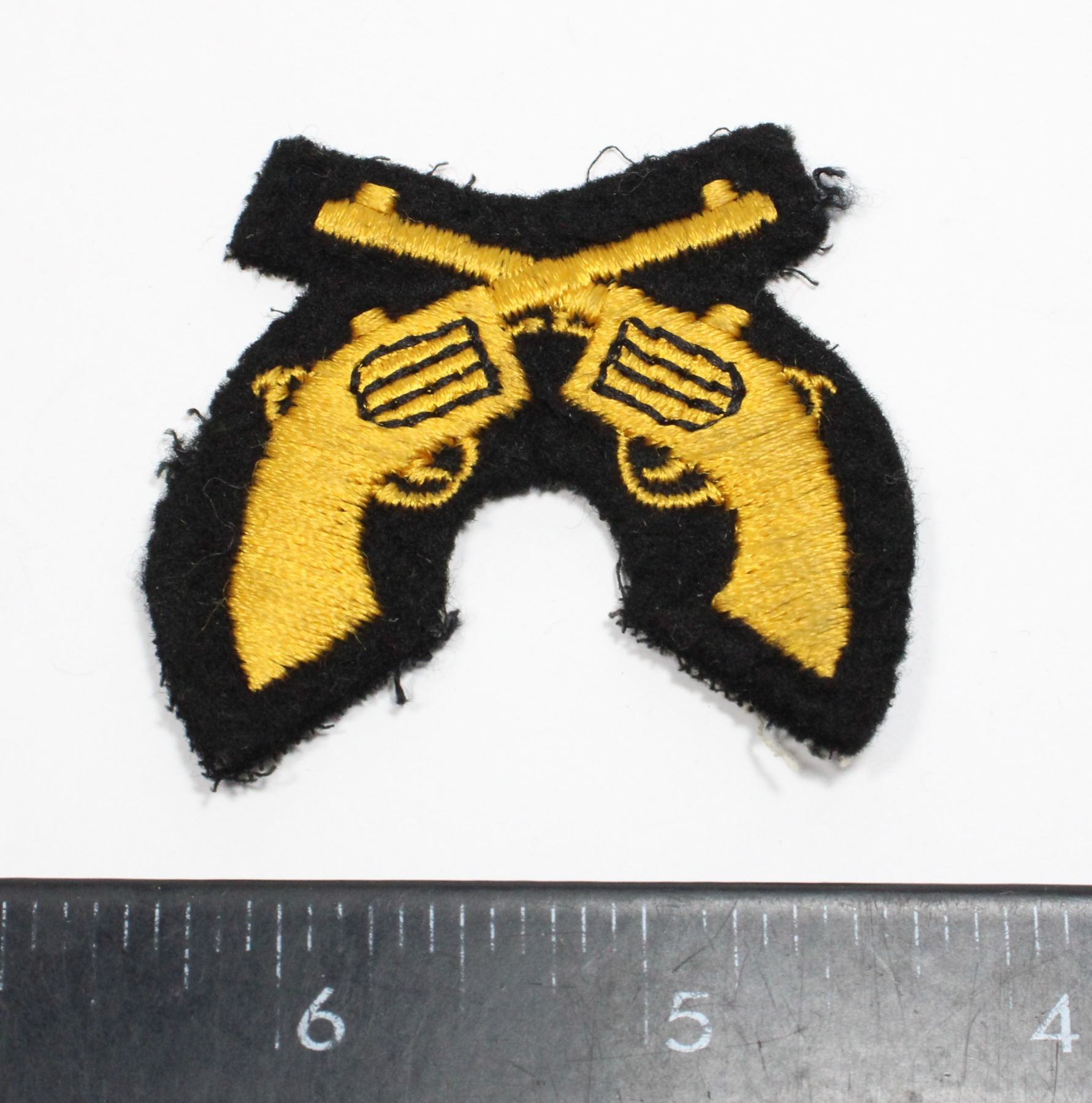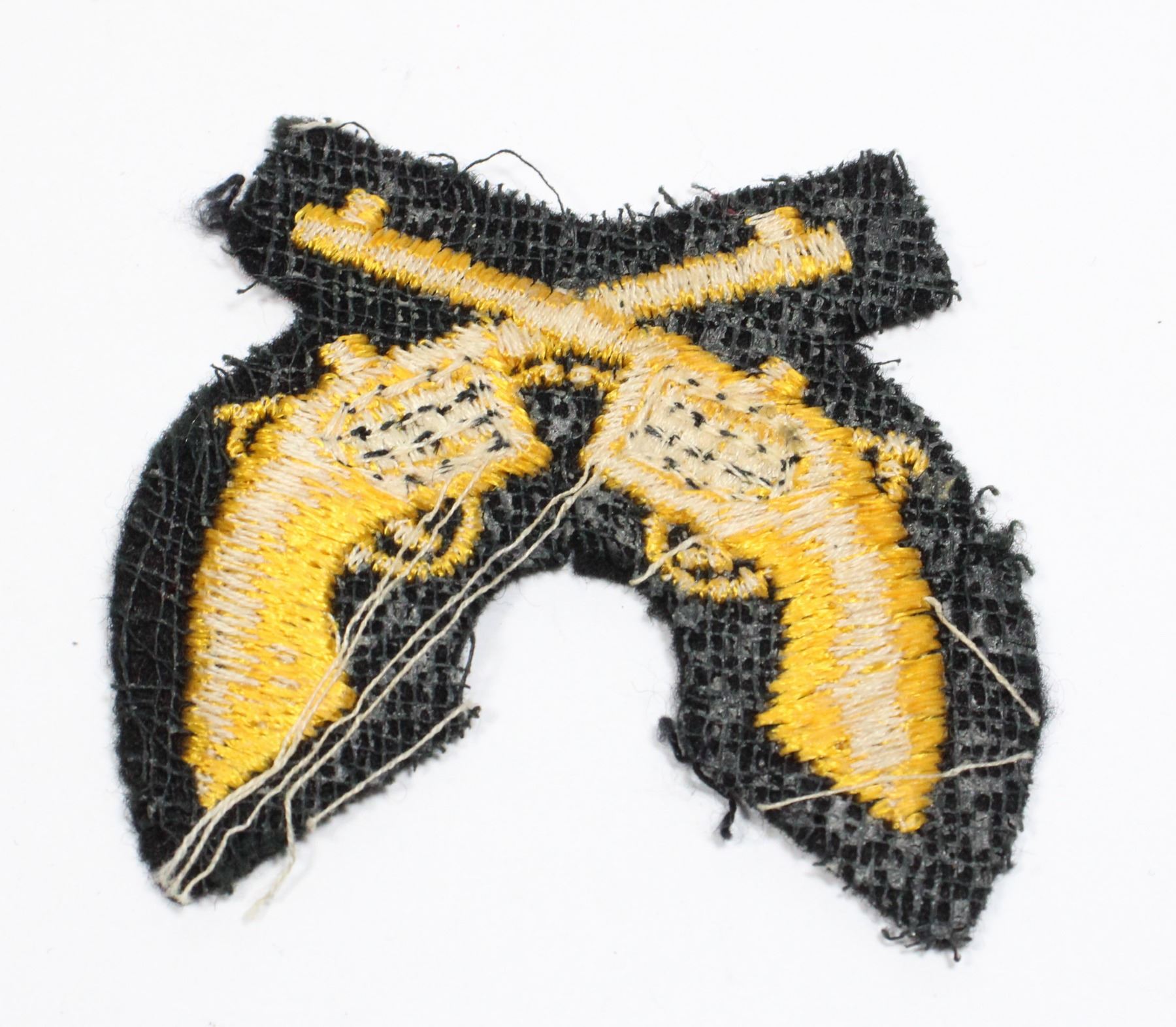 YELLOW SILK ON BLACK BACKING. PICTURED ON PAGE 281 IN REFERENCE "INSIGNIA OF THE ROYAL CANADIAN MOUNTED POLICE 1873-1998" BY DONALD J. KLANCHER. ROYAL CANADIAN MOUNTED POLICE INSIGNIA