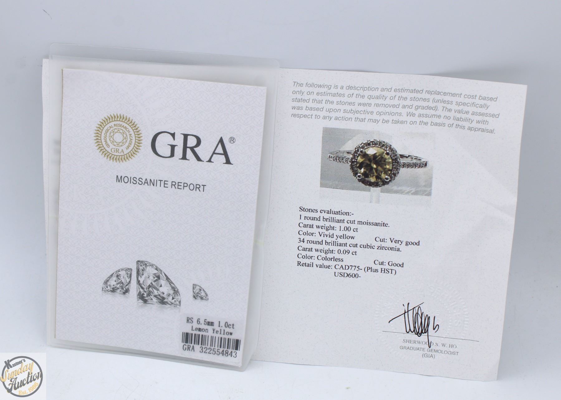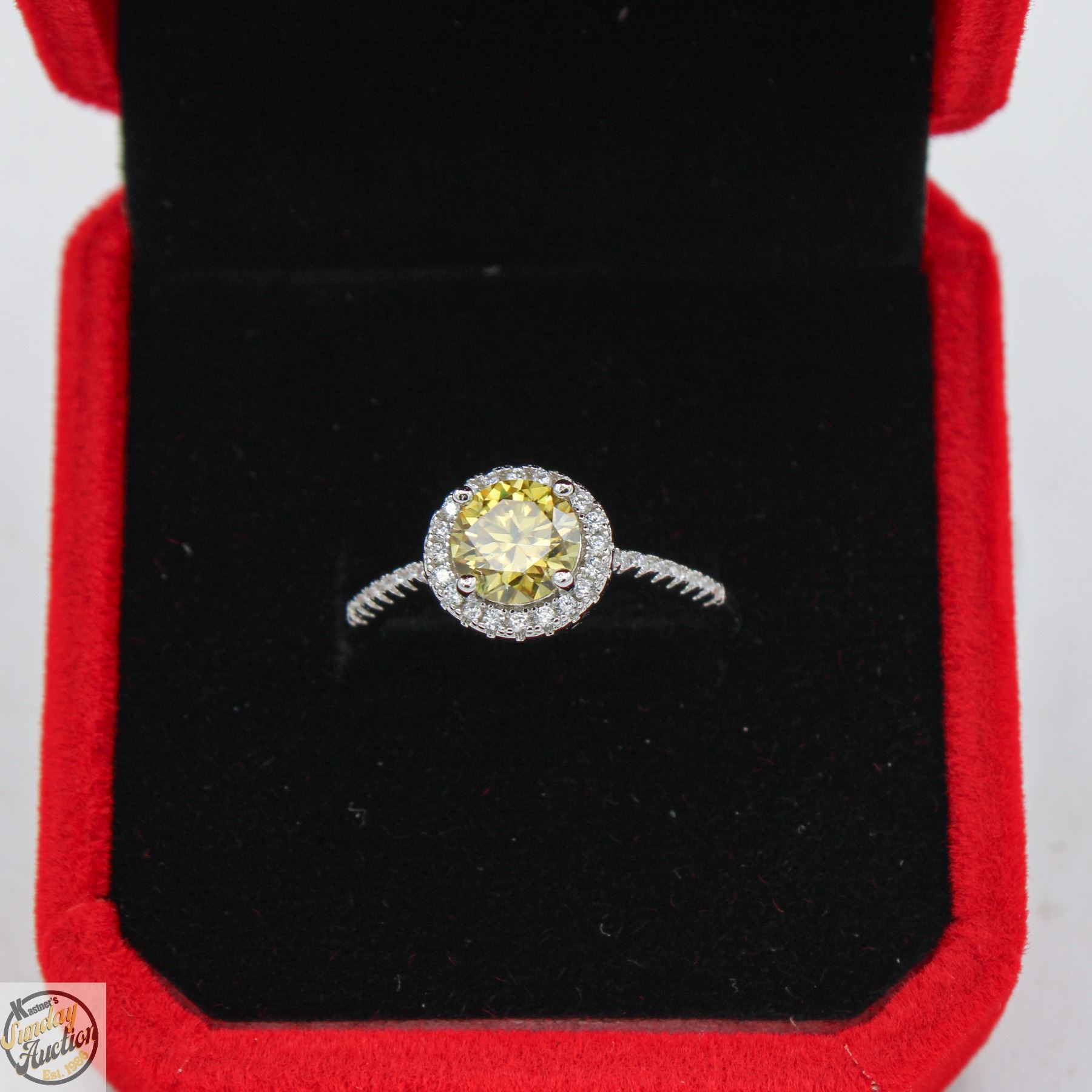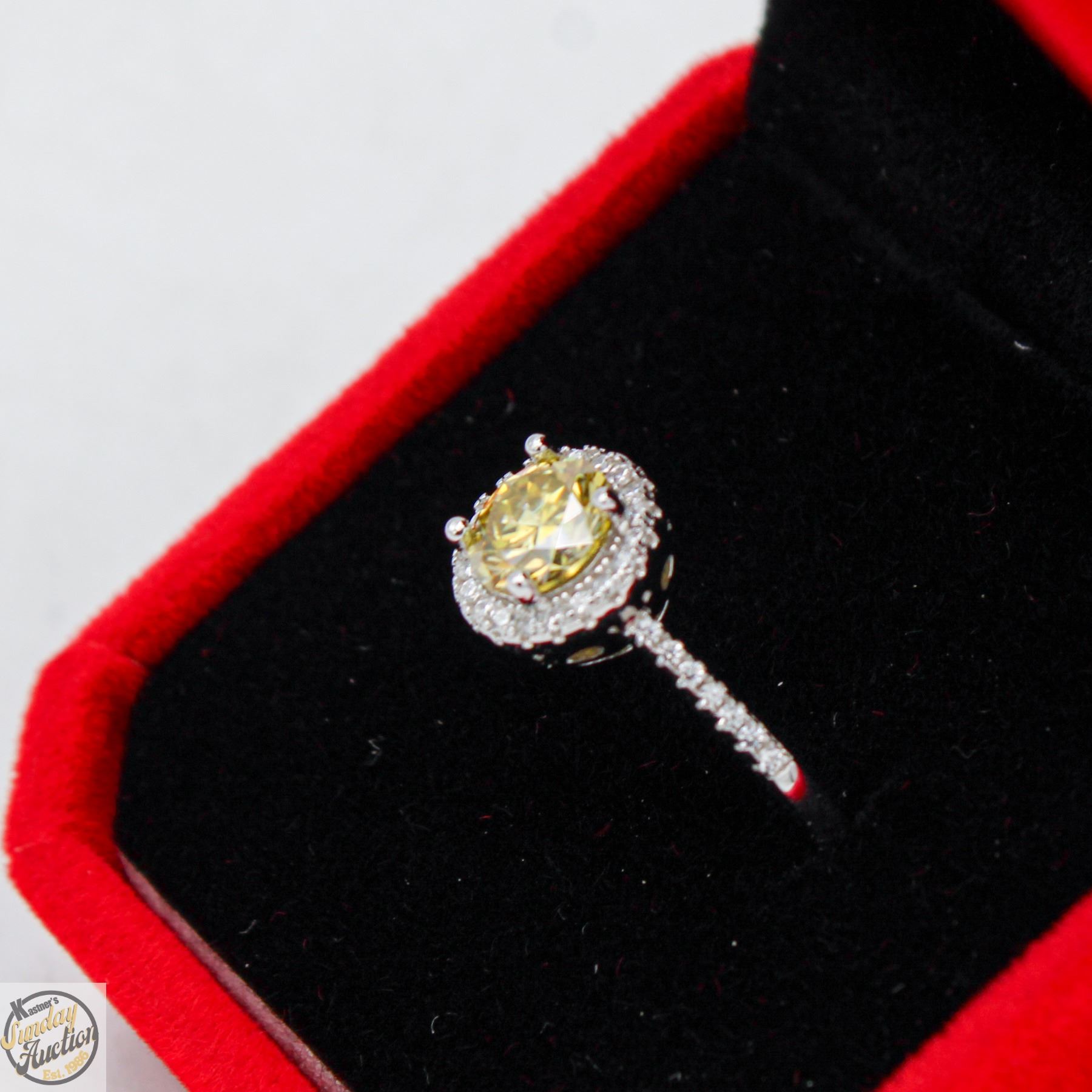 CUT MOISSANITE STONE VVS VIVID YELLOW COLOR WITH 34 ROUND BRILLIANT CUT CUBIC ZIRCONIA SET IN ROUND HALO AND IN SHANKS SET IN 925 SILVER RING SIZE 7.25 RETAIL VALUE $775.00 **ALL ITEMS MUST BE REMOVED BY 5PM SATURDAY, SEPTEMBER 6TH 2025. ALL REMAINING ITEMS WILL BE SUBJECT TO A $6.00 PER DAY STORAGE CHARGE. ANY ITEMS REMAINING AFTER MONDAY, SEPTEMBER 22ND 2025 WILL BE CONSIDERED FORFEITED. NO REFUNDS WILL BE ISSUED FOR FORFEITED ITEMS. TO SCHEDULE A PICK UP APPOINTMENT CLICK HERE