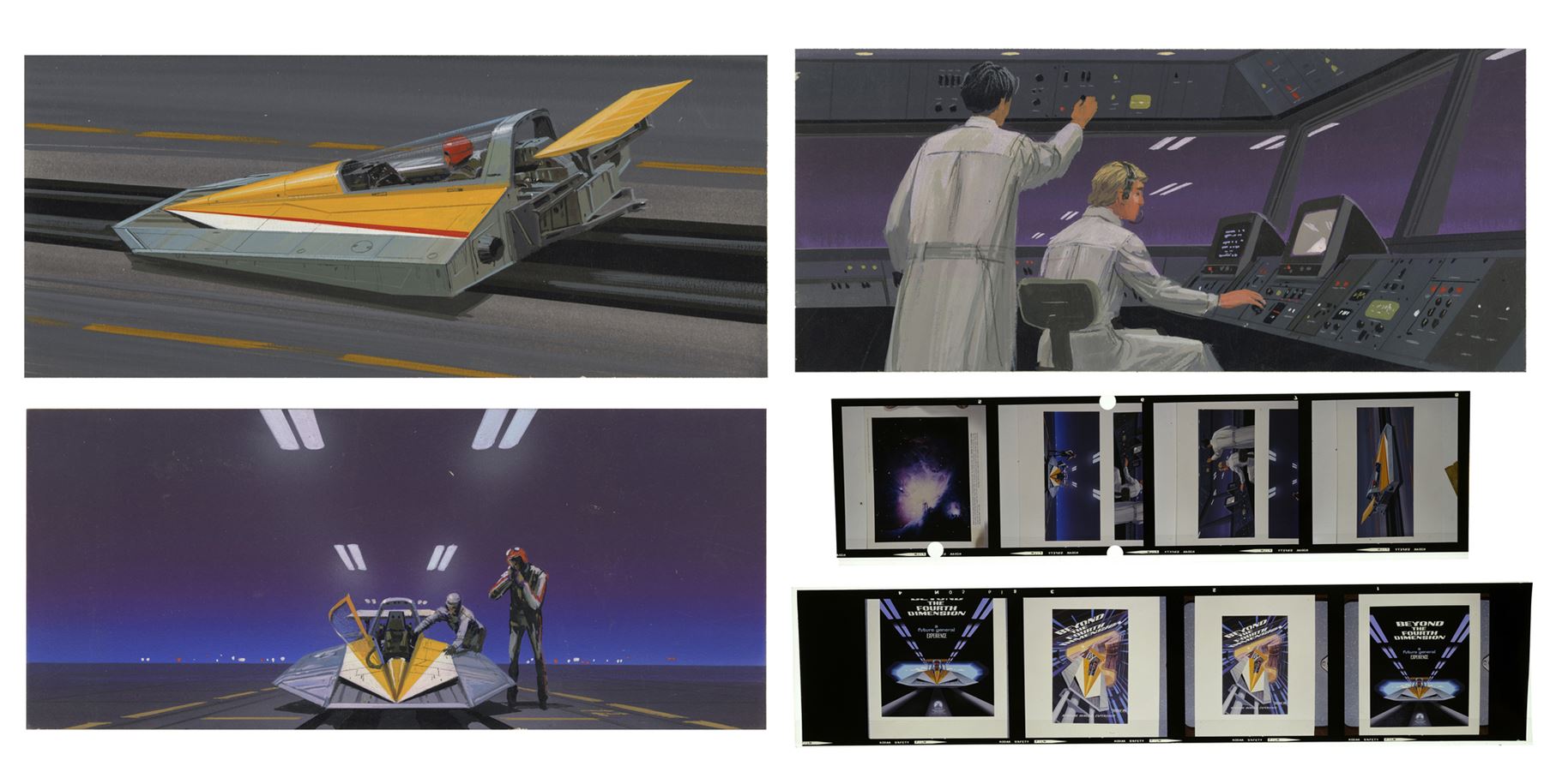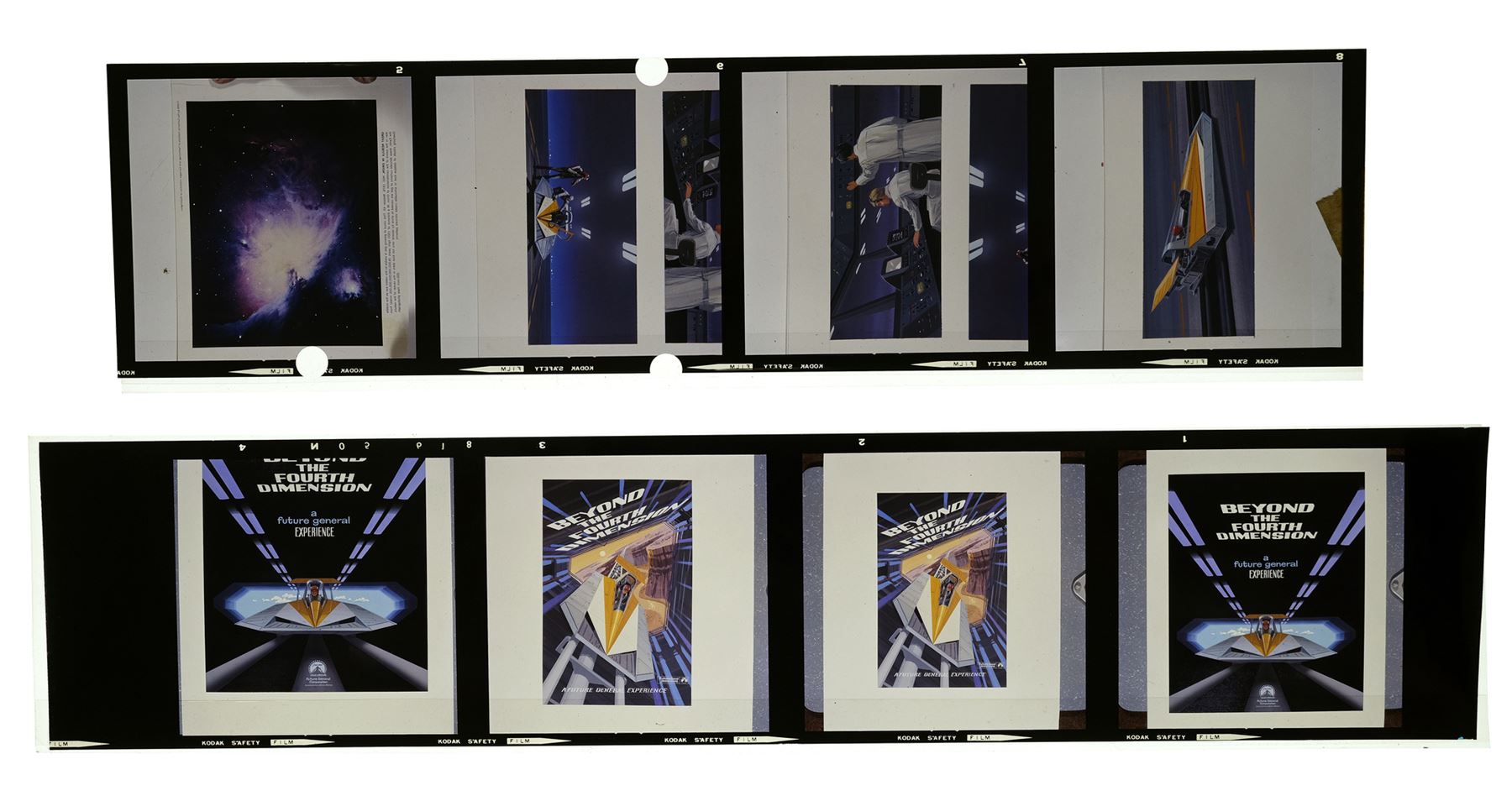 SHOWSCAN - Douglas Trumbull Collection: Set of Three Hand-Painted Ralph McQuarrie Showscan Concept Artworks with Transparencies - Three concept artworks hand-painted by legendary concept illustrator Ralph McQuarrie with two strips of transparencies from a Showscan production. Created by legendary special photographic effects artist Douglas Trumbull to market and showcase Showscan, a groundbreaking film process which utilized 70mm film photographed and projected at 60 frames per second, Showscan Film Corporation produced a number of visionary productions, including a 1987 commercial for Chevrolet and the Canadian National Tower's futuristic simulation ride Tour of the Universe.