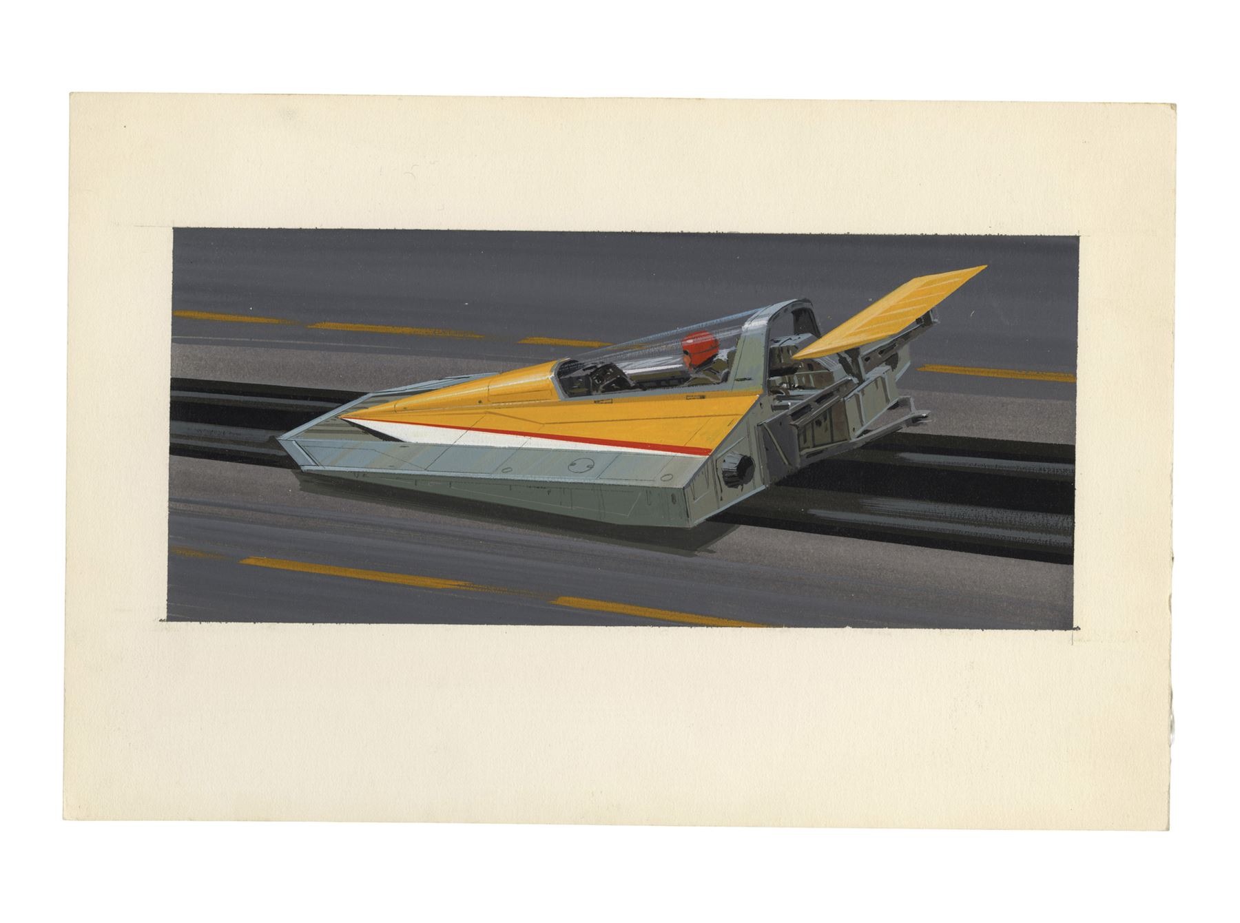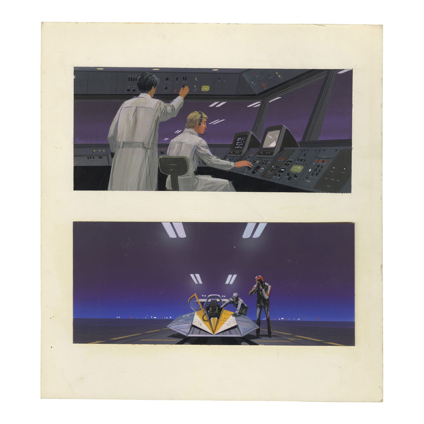 This lot originates from the collection of Trumbull. The artworks, which depict a futuristic racing vehicle and control tower, are rendered in mixed media on two illustration boards (each illustration as 9.25" x 4"). The transparencies feature never-before-seen artwork by McQuarrie depicting futuristic vehicles and, in one case, feature three hole punches along the borders. The boards exhibit some bending and edge wear. Dimensions: (largest) 12.5" x 11.5" (31.75 cm x 29.25 cm)