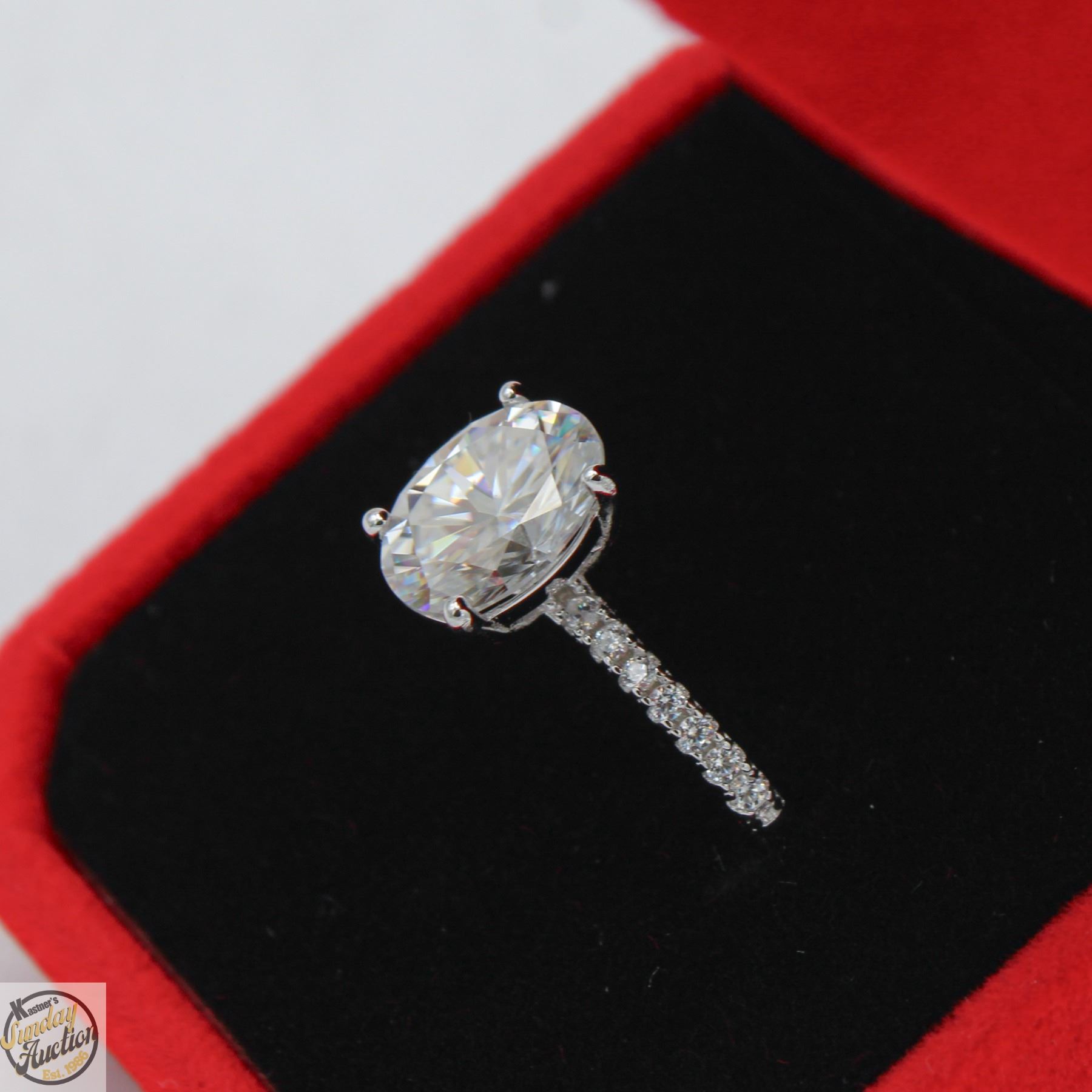 CUT MOISSANITE STONE VVS D COLOR SET IN CENTER WITH 16 ROUND BRILLIANT CUT CUBIC ZIRCONIA SET IN SHANKS AND SET IN 925 SILVER RING SIZE 7 RETAIL VALUE $1,275.00 **ALL ITEMS MUST BE REMOVED BY 5PM SATURDAY, SEPTEMBER 6TH 2025. ALL REMAINING ITEMS WILL BE SUBJECT TO A $6.00 PER DAY STORAGE CHARGE. ANY ITEMS REMAINING AFTER MONDAY, SEPTEMBER 22ND 2025 WILL BE CONSIDERED FORFEITED. NO REFUNDS WILL BE ISSUED FOR FORFEITED ITEMS. TO SCHEDULE A PICK UP APPOINTMENT CLICK HERE