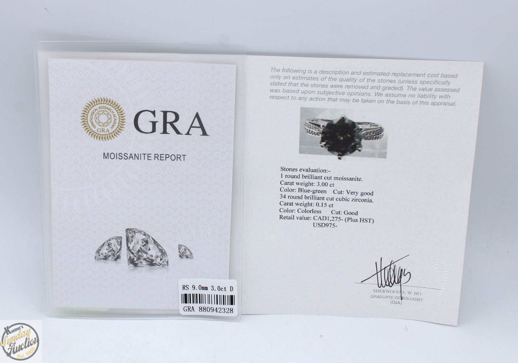 CUT MOISSANITE STONE VVS BLUE-GREEN COLOR SET IN CENTER WITH 34 ROUND BRILLIANT CUT CUBIC ZIRCONIA SET IN DUAL ROWS IN SHANKS AND SET IN 925 SILVER RING SIZE 6 RETAIL VALUE $1,275.00 **ALL ITEMS MUST BE REMOVED BY 5PM SATURDAY, SEPTEMBER 6TH 2025. ALL REMAINING ITEMS WILL BE SUBJECT TO A $6.00 PER DAY STORAGE CHARGE. ANY ITEMS REMAINING AFTER MONDAY, SEPTEMBER 22ND 2025 WILL BE CONSIDERED FORFEITED. NO REFUNDS WILL BE ISSUED FOR FORFEITED ITEMS. TO SCHEDULE A PICK UP APPOINTMENT CLICK HERE