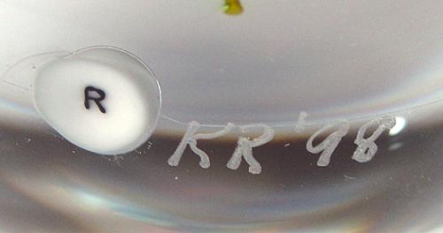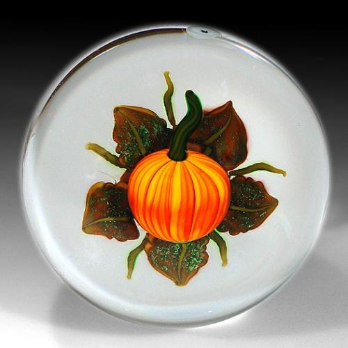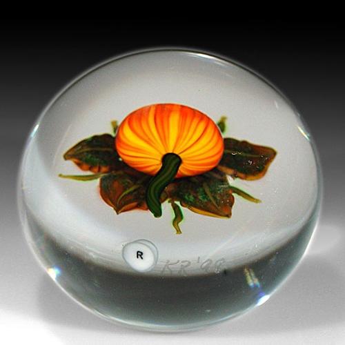 Ken Rosenfeld 1998 small pumpkin paperweight, with an orange pumpkin, on a bed of green and brown leaves, over clear ground. Signed/dated. "K" signature cane. Diameter 2 1/2". NO RESERVE