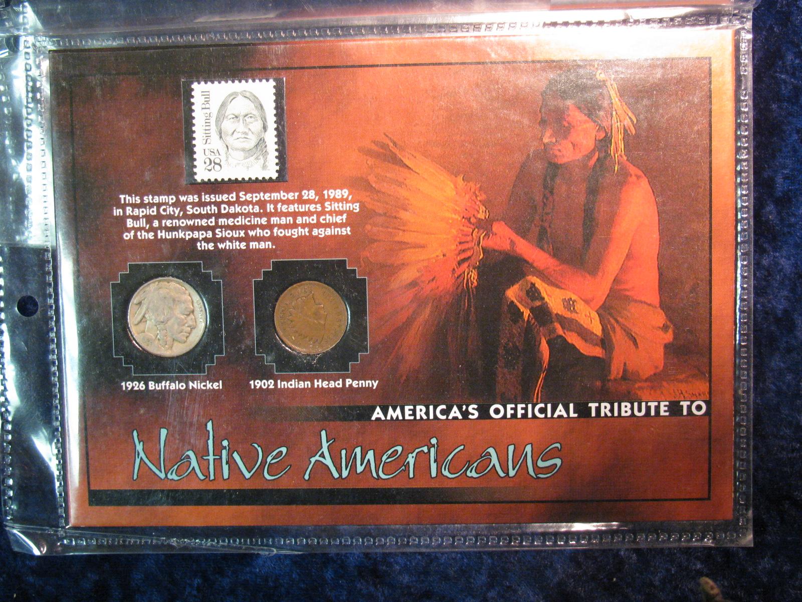 316. Native American Official Tribute Set. Includes .28c mint Sitting Bull Stamp; 1926 P Buffalo Nickel; & 1902 Indian Cent in a special holder.