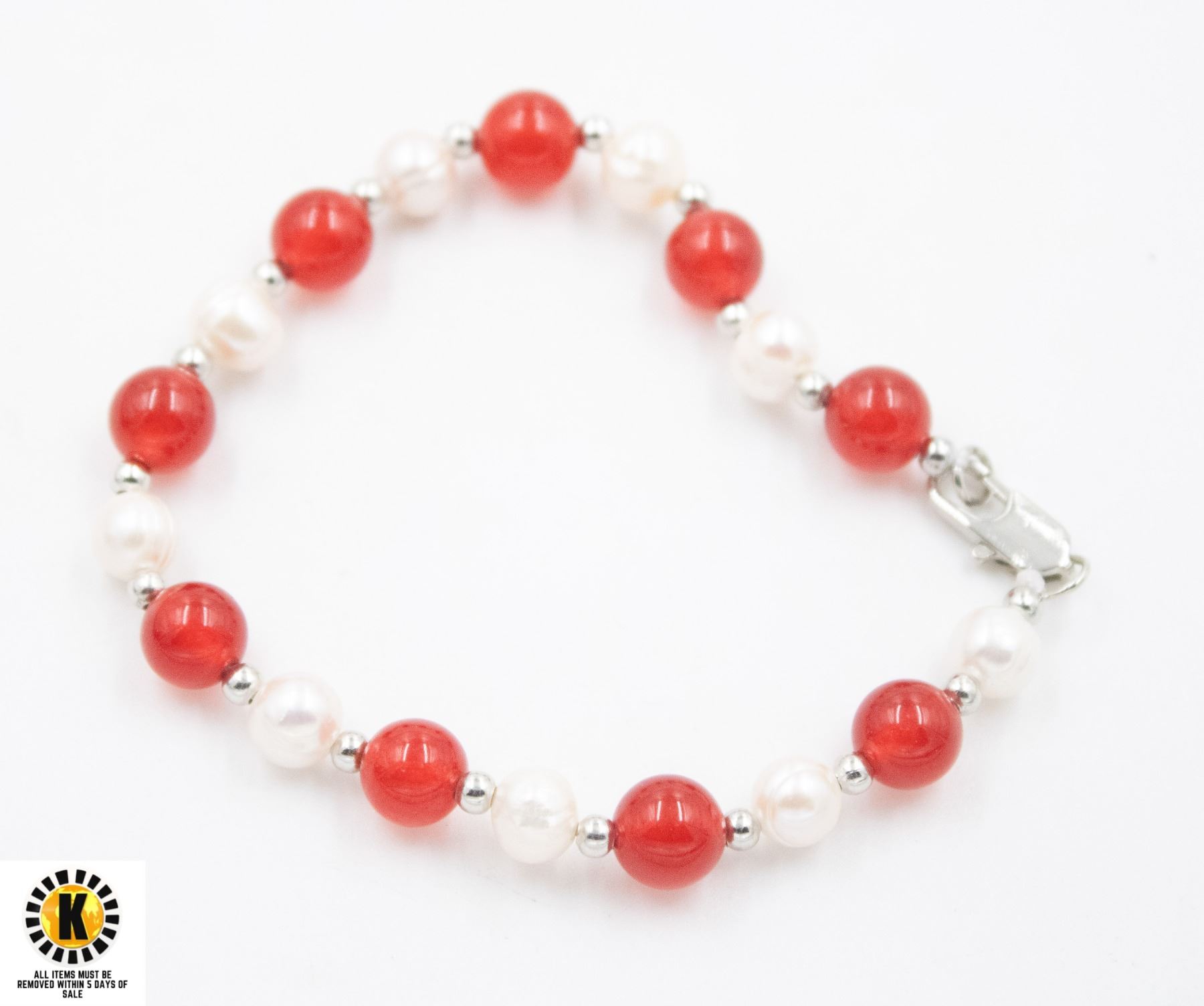 #317- FRESH WATER PEARL , RED JADE BRACELET