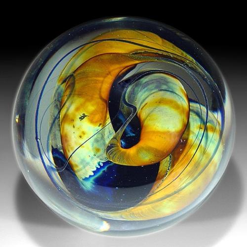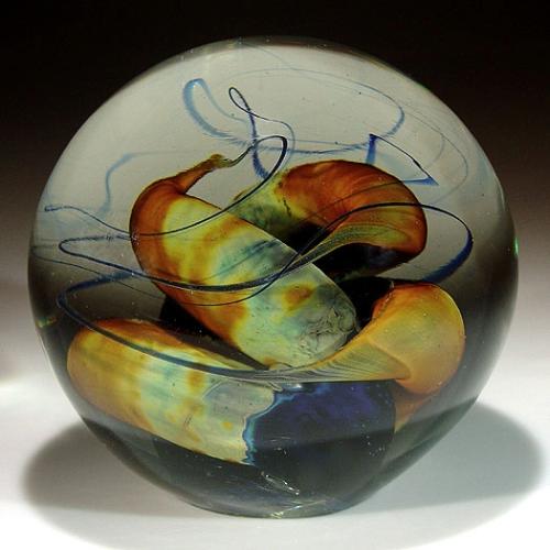 Kent Ipsen 1982 magnum abstract design paperweight, composed of four, curved, conical forms, in shades of amber and ivory, which extend from a shared cobalt blue base. Wisps of cobalt blue spiral from the pointed tips of the forms. Signed/dated. Diameter 4 5/8". NO RESERVE