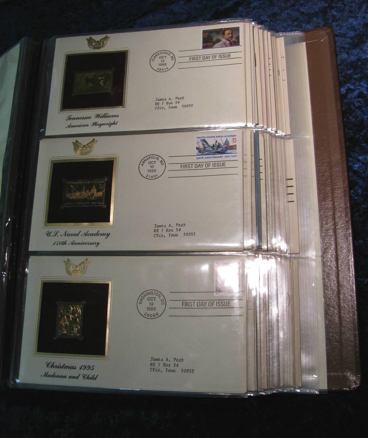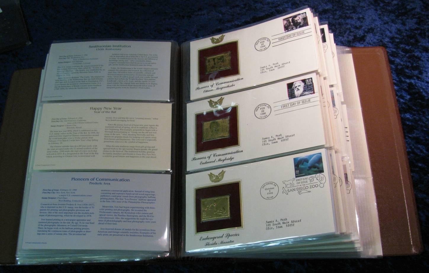 317. Large Simulated Leather Bound Album titled "Golden Replicas of U.S. Stamps" Proof replicas on a gleaming surface of 22K gold. Features 45 different covers which, originally sold for $7.25 each. Total value $326.25. Postage on this large album will probably run about $35.00.