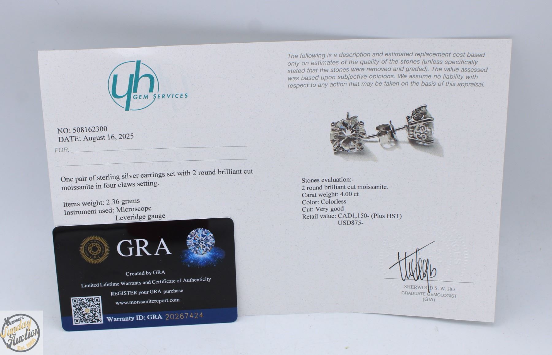 BRILLIANT CUT MOISSANITE STONES VVS D COLOR SET IN 6 CLAW FILAGREE HEAD SET IN 925 SILVER EARRINGS RETAIL VALUE $1,150.00 **ALL ITEMS MUST BE REMOVED BY 5PM SATURDAY, SEPTEMBER 6TH 2025. ALL REMAINING ITEMS WILL BE SUBJECT TO A $6.00 PER DAY STORAGE CHARGE. ANY ITEMS REMAINING AFTER MONDAY, SEPTEMBER 22ND 2025 WILL BE CONSIDERED FORFEITED. NO REFUNDS WILL BE ISSUED FOR FORFEITED ITEMS. TO SCHEDULE A PICK UP APPOINTMENT CLICK HERE