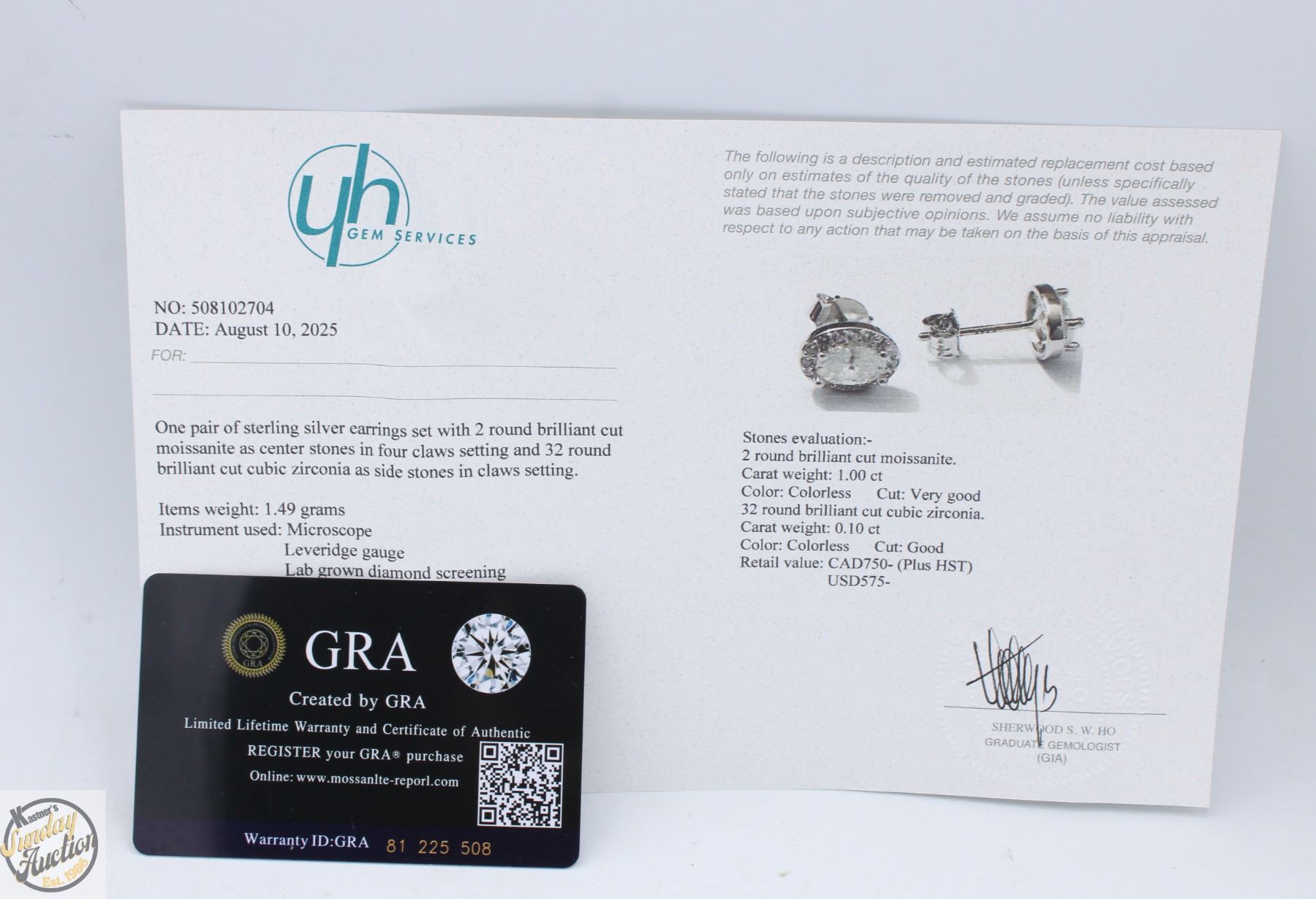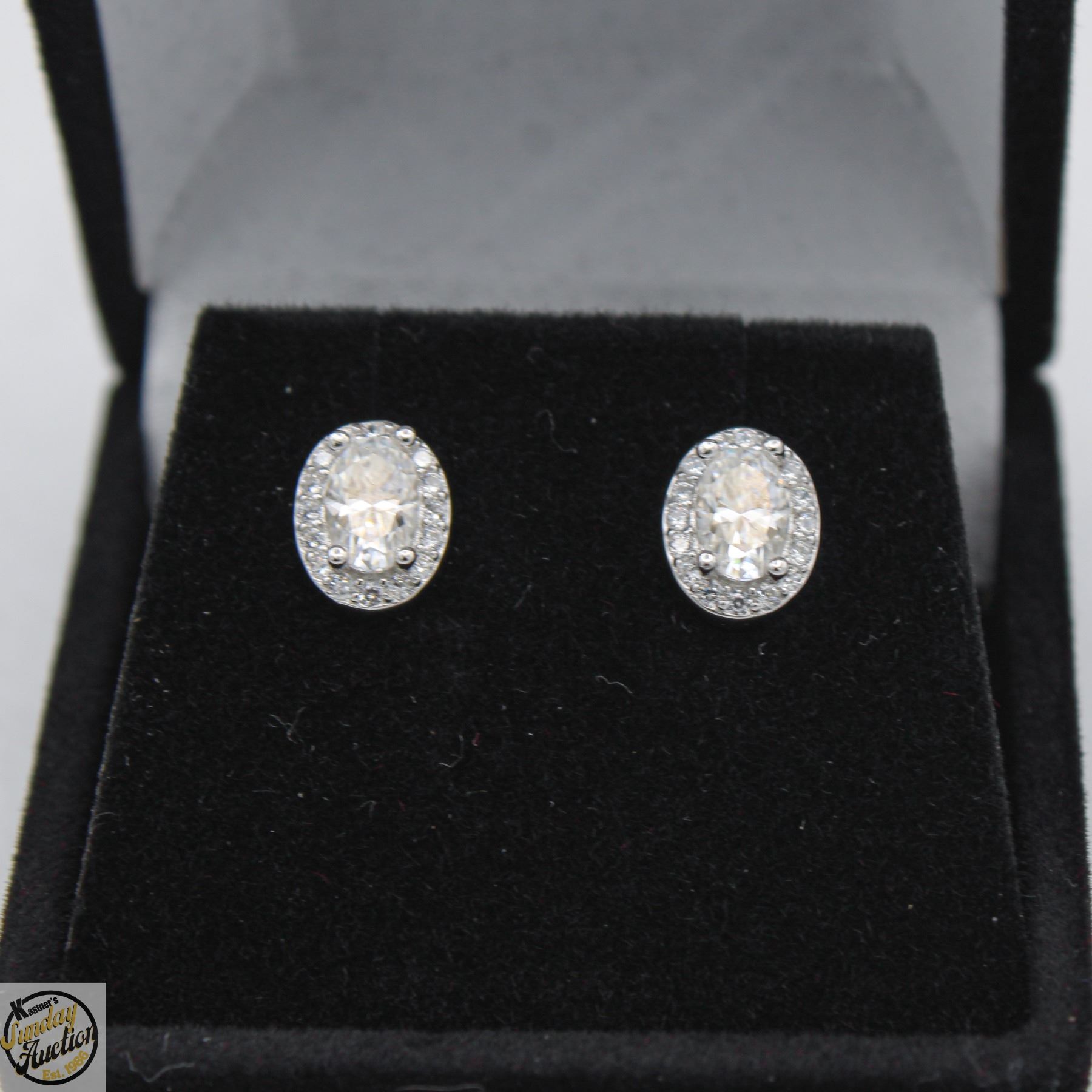 BRILLIANT CUT MOISSANITE STONES VVS D COLOR WITH 32 ROUND BRILLIANT CUT CUBIC ZIRCONIA SET IN OVAL SHAPED HALOS SET IN 925 SILVER EARRINGS RETAIL VALUE $750.00 **ALL ITEMS MUST BE REMOVED BY 5PM SATURDAY, SEPTEMBER 6TH 2025. ALL REMAINING ITEMS WILL BE SUBJECT TO A $6.00 PER DAY STORAGE CHARGE. ANY ITEMS REMAINING AFTER MONDAY, SEPTEMBER 22ND 2025 WILL BE CONSIDERED FORFEITED. NO REFUNDS WILL BE ISSUED FOR FORFEITED ITEMS. TO SCHEDULE A PICK UP APPOINTMENT CLICK HERE