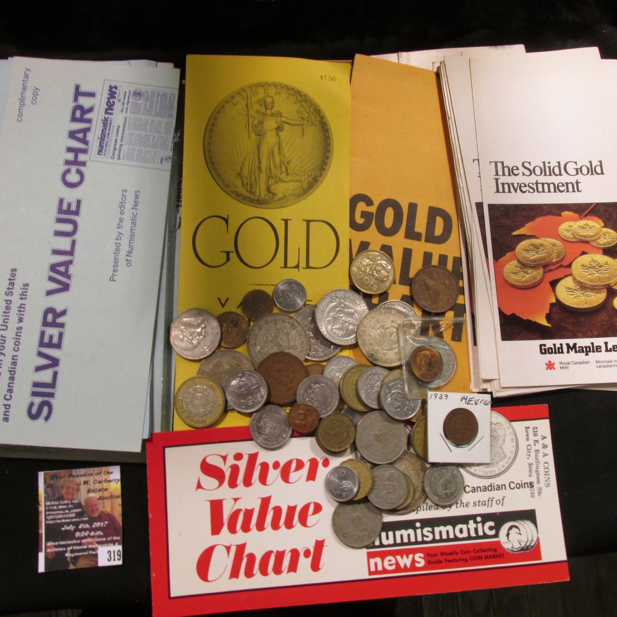 319.Large group of Gold and Silver Charts, flyers, and broschures as well as a nice selection of Mexican Coins including Silvers coins.