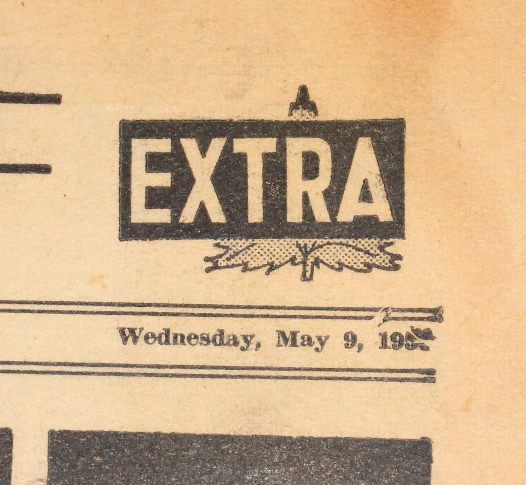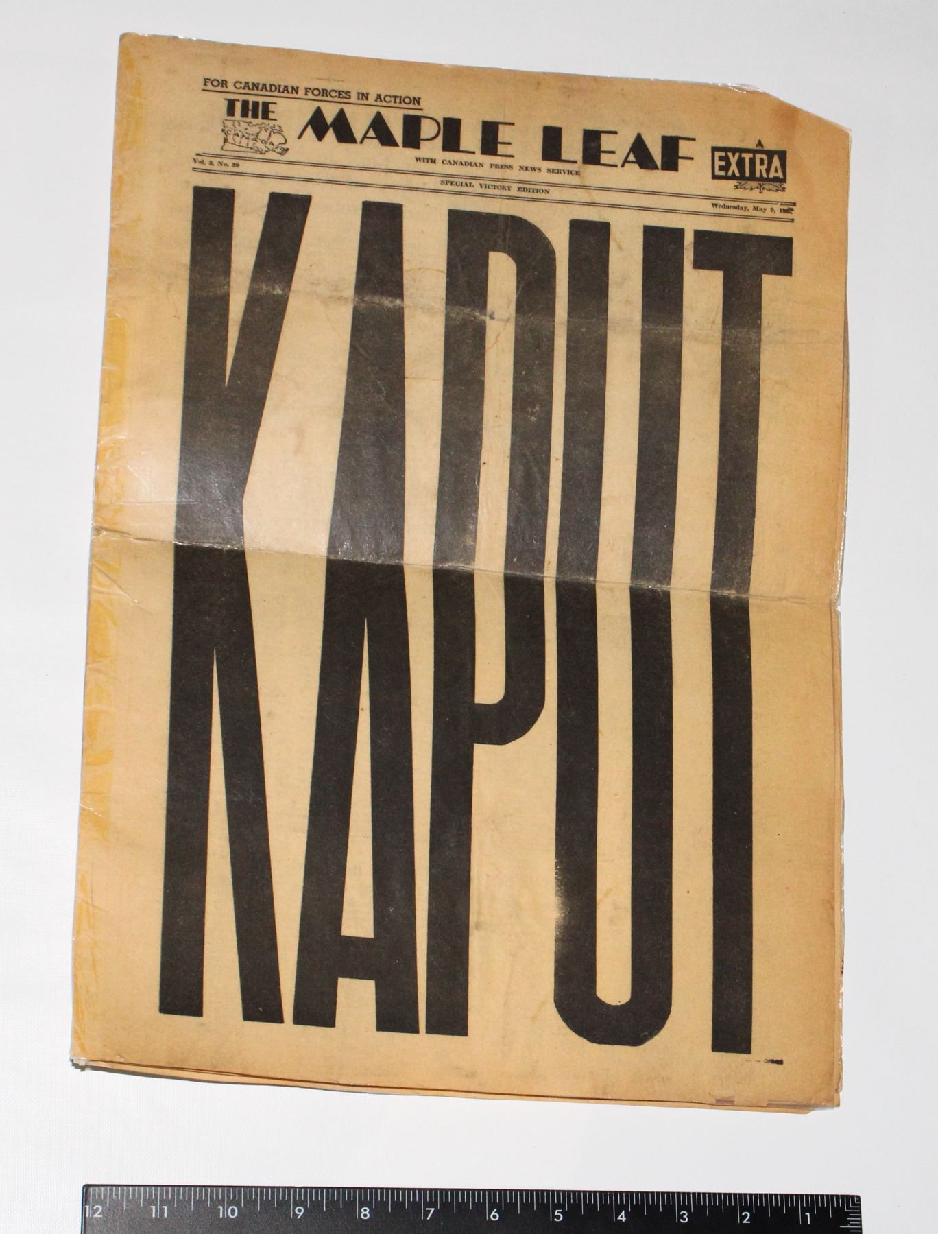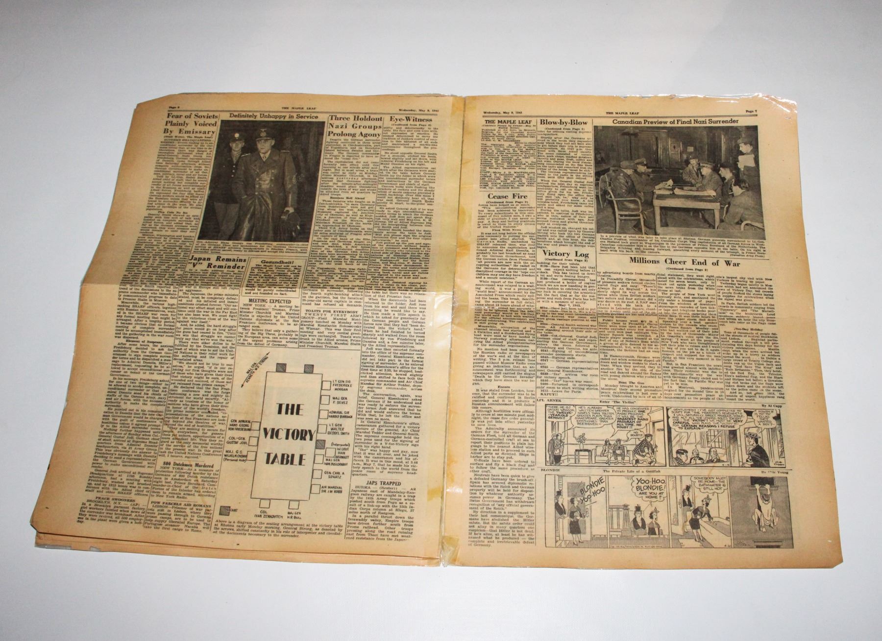KAPUT WEDNESDAY MAY 9TH 1945 LAMINATED COMPLETE WORLD WAR TWO CANADIAN NEWSPAPER WITH COMIC ON REVERSE ALLIED FORCES VICTORY